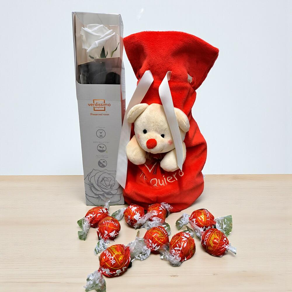 Preciosa bolsa guarda cosas de peluche con el texto te quiero bordado en su interior una rosa preservada Blanca y 9 bombones Lind