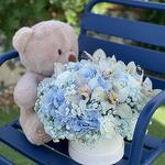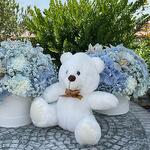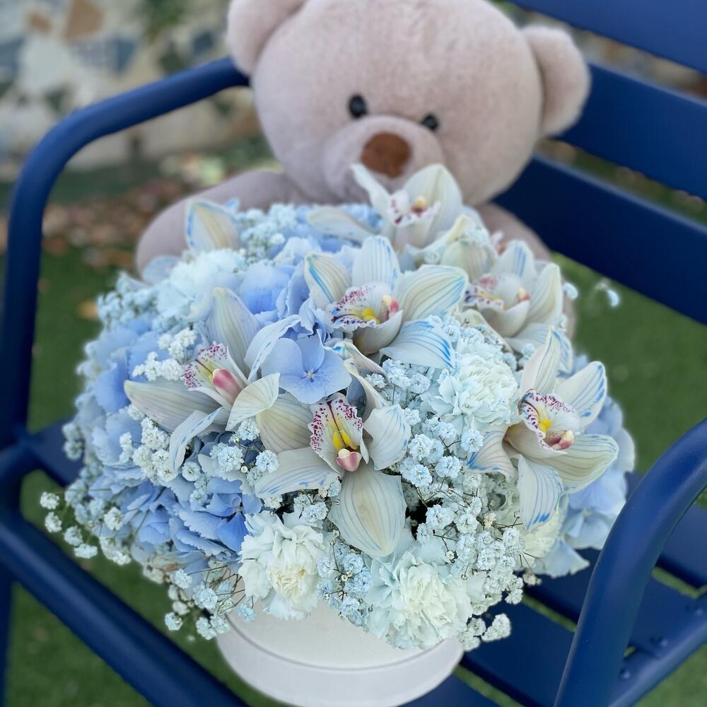 Teddy bear - 1 ud. hortensias - 3 ud. claveles (dianthus) - 10 ud. orquídeas - 7 ud. paniqulata - 5 ud.