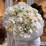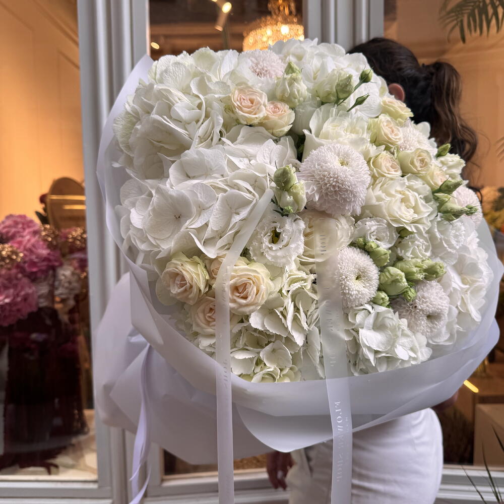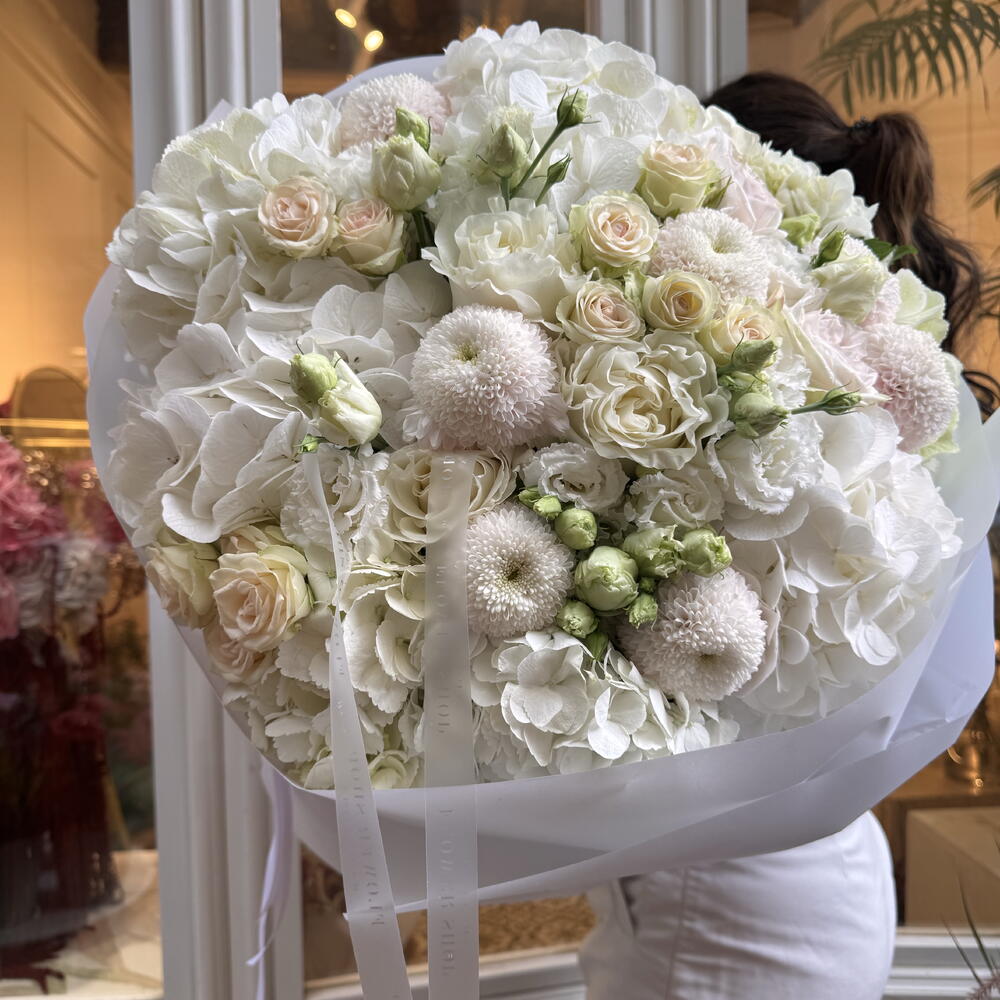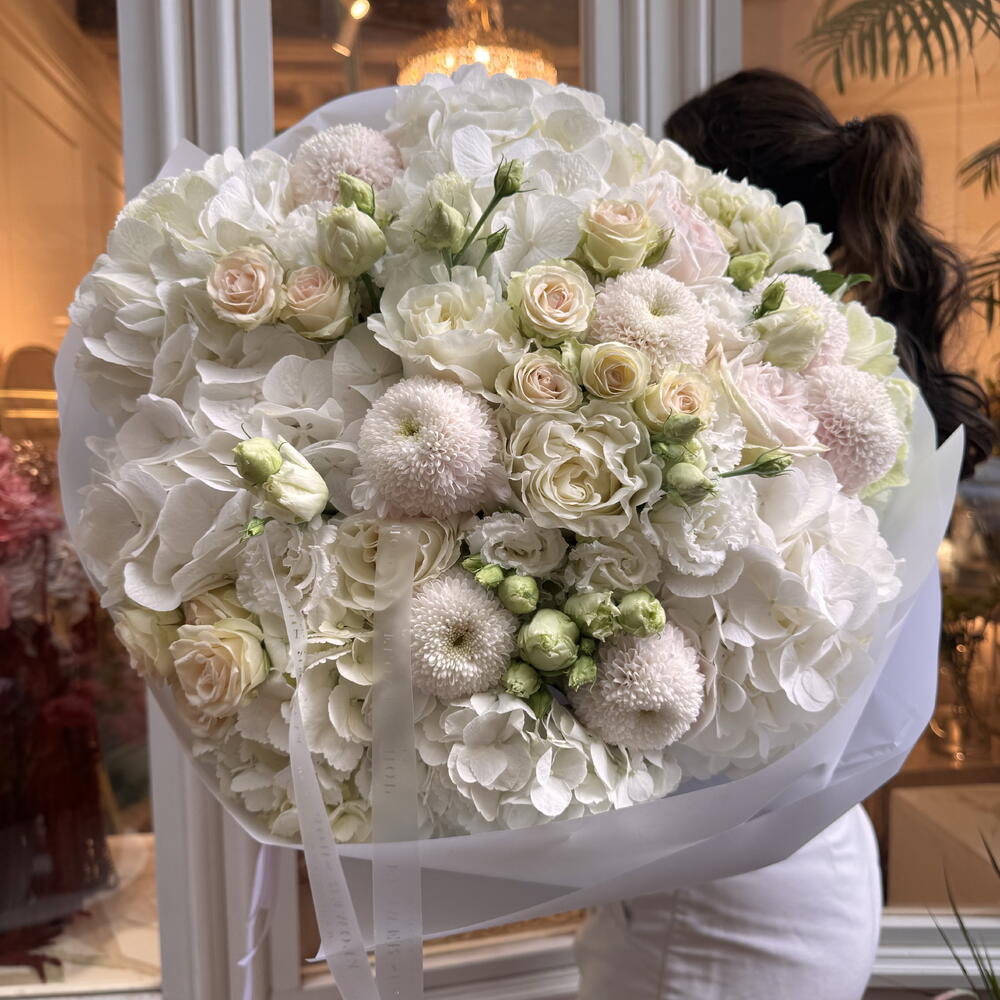 hydrangea white - 7 ud. eustomas blancas y rosas - 5 ud. rosas spray rosa suave - 5 ud. crisantemo blanco pompón - 5 ud. rosas blancas de algodón - 4 ud.