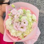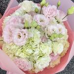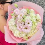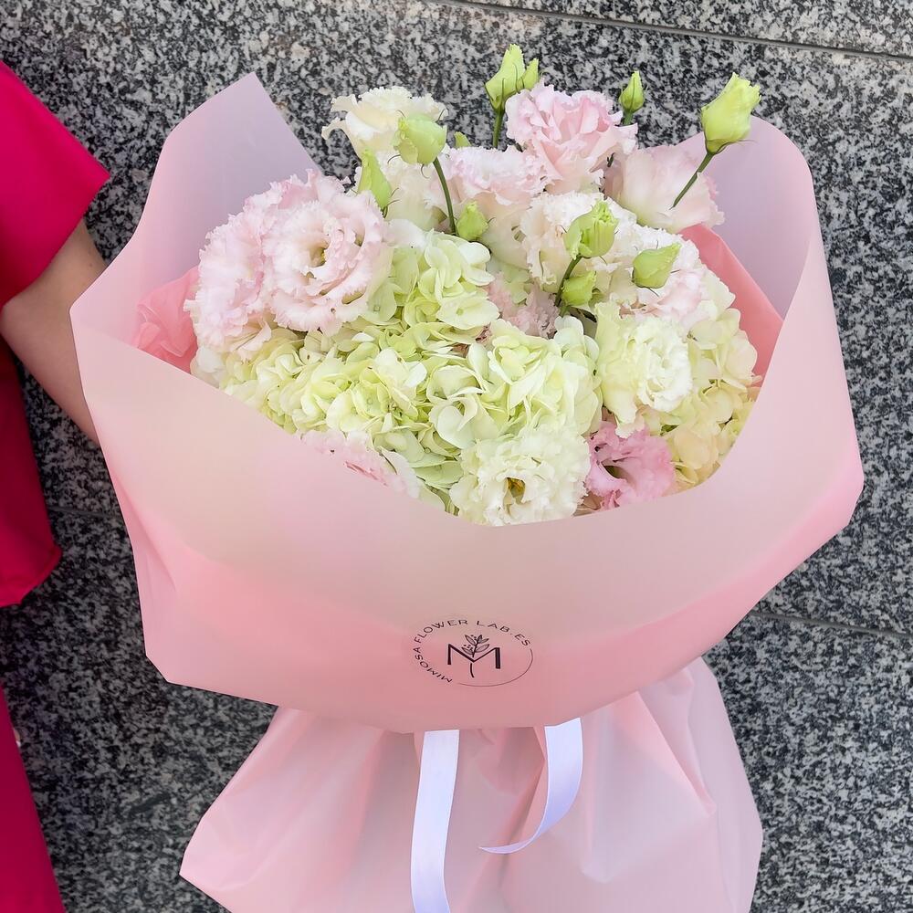 Un delicado ramo en tonos pastel que combina la frescura de las hortensias blancas y verdes con la elegancia de los lisianthus en suaves tonalidades rosadas. Este diseño es perfecto para transmitir ternura y serenidad, ideal para celebrar momentos especiales con un toque de frescura y sofisticación. Un regalo que encantará por su belleza y sencillez.