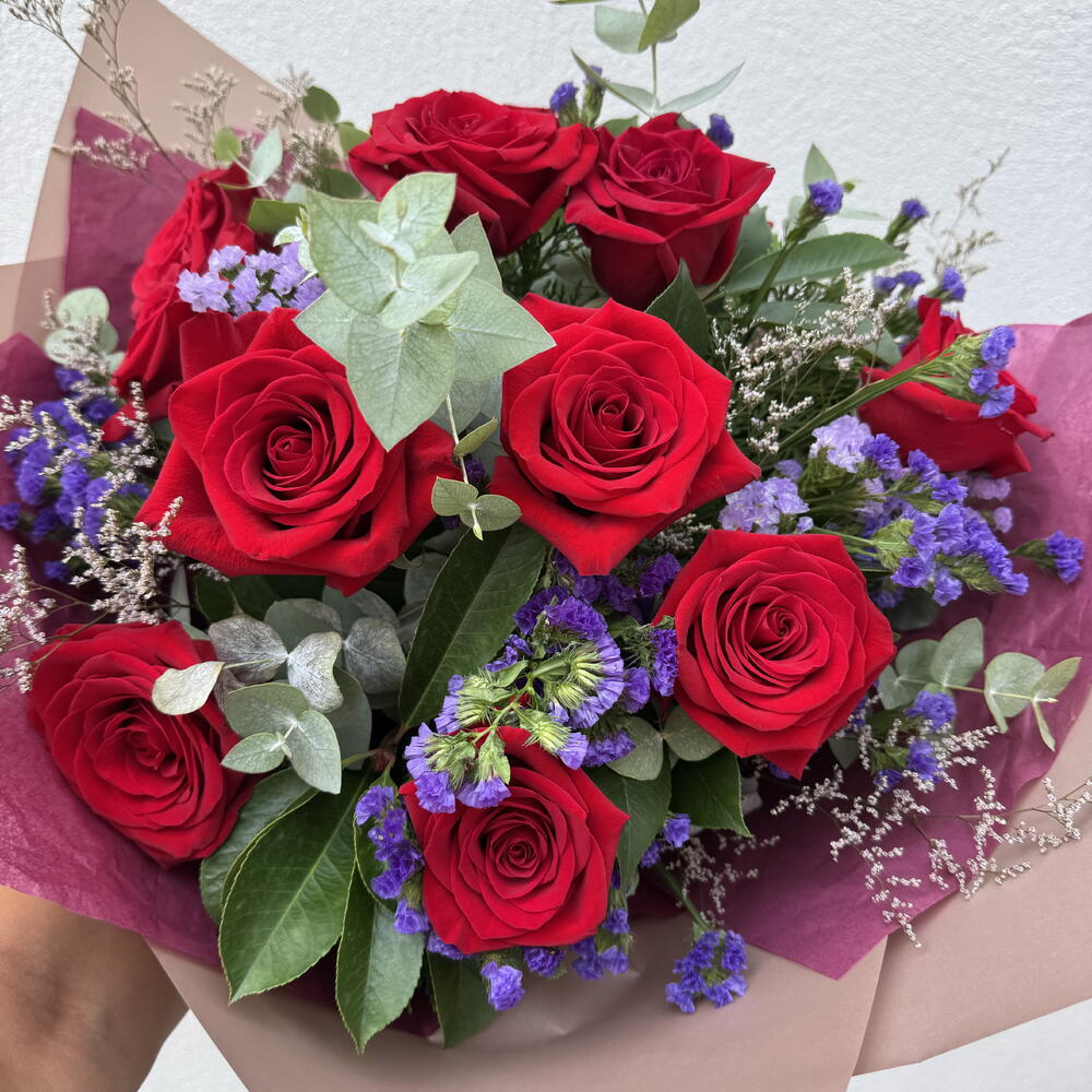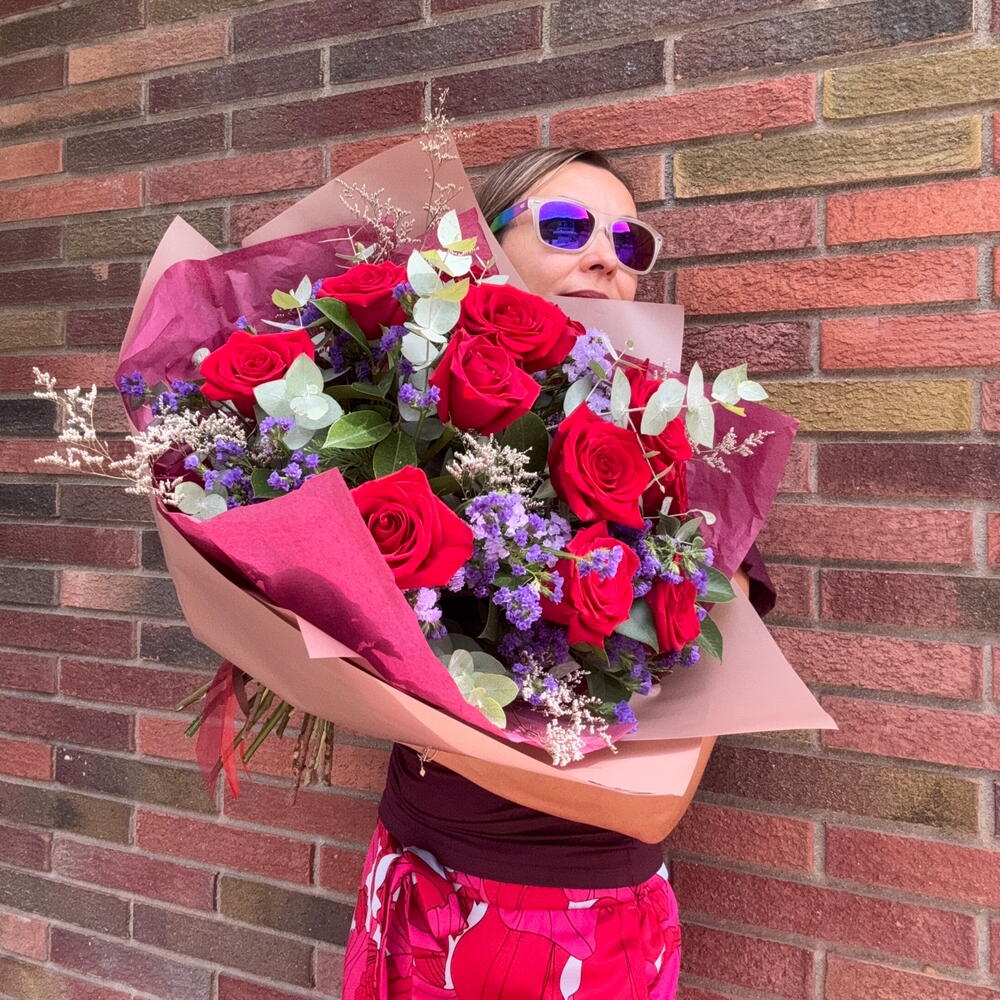 Rosas de Terciopelo Violeta Medianoche Disfrute de una espectacular evolución del ramo tradicional de doce rosas. Este arreglo artesanal equilibra el rojo intenso y apasionado de doce rosas premium con la belleza etérea y texturizada del estátice púrpura y el limonium. Hemos diseñado este ramo para ofrecer un sofisticado contraste de color; los vibrantes acentos violetas actúan como un marco elegante que realza el cálido carmesí de las rosas. Con un generoso ancho de 40 cm, este arreglo ofrece una silueta exuberante y completa que supera a un ramo de rosas estándar. • Las flores: 12 rosas rojas de tallo largo de grado A. • Los acentos: 5 tallos de estátice púrpura y 4 tallos de limonium para un efecto de niebla violeta de larga duración. • El diseño: Un estilo moderno que combina el romance tradicional con texturas florales contemporáneas. • La presentación: Atado a mano por expertos y envuelto en un papel bitono exclusivo para realzar la paleta violeta-carmesí. •