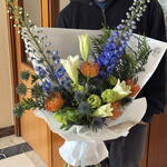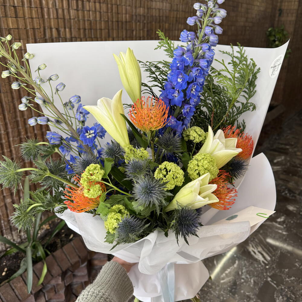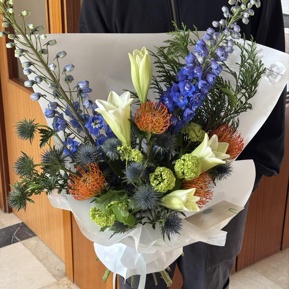 Viburnum - 5 ud. leucospermum - 4 ud. eryngium - 5 ud. delphinium - 2 ud. lilium nacional - 4 ud.
