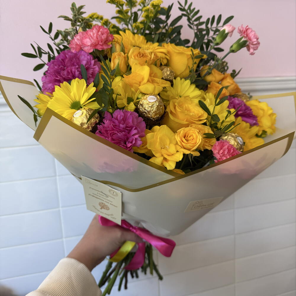 Gerbera - 2 ud. margaritas - 3 ud. claveles - 6 ud. rosas amarillas - 5 ud. mini rosas - 2 ud. verdes varios - 5 ud. clavelinas - 3 ud. papel y cintas decorativas - 1 ud. bombones ferreros - 6 ud.