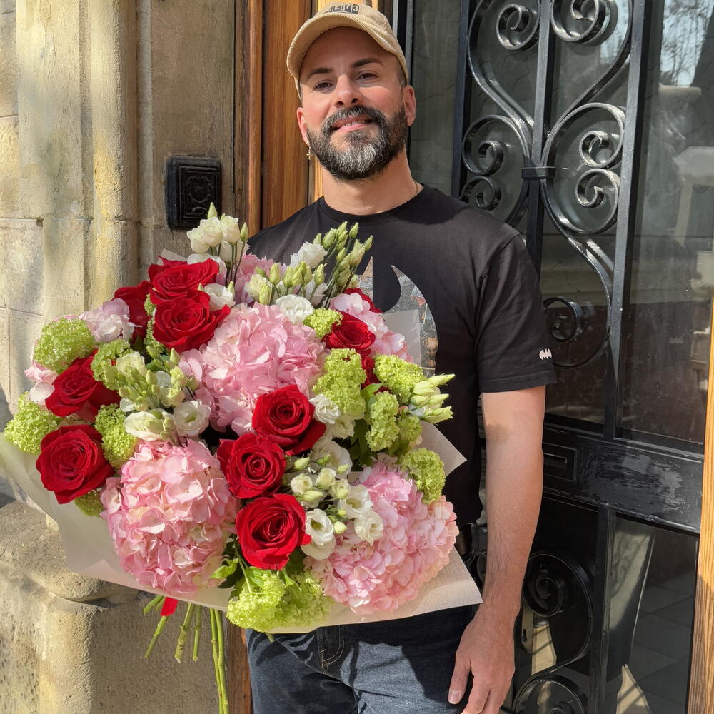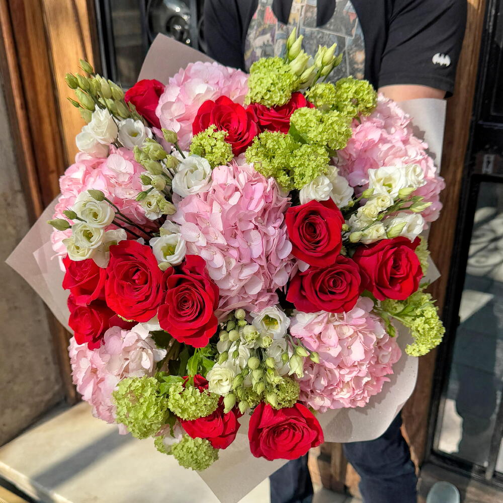Un ramo sofisticado y apasionado que combina 🌹 rosas rojas intensas, 🌸 delicadas hortensias rosas y 🤍 lisianthus blancos. Con un toque fresco de flores verdes, este ramo es perfecto para expresar amor eterno y hacer de cada momento algo inolvidable.