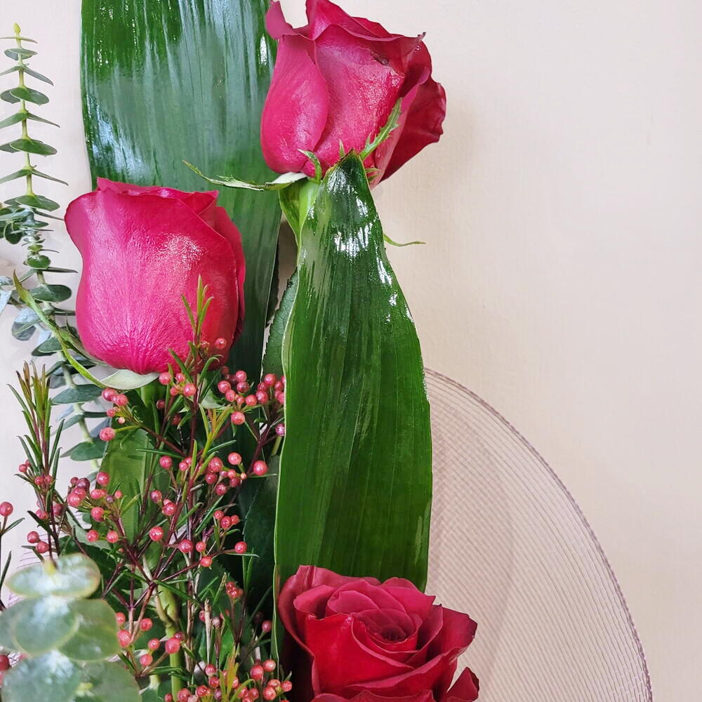 Aspidistra - 2 ud. eucalyptus baby blue - 3 ud. rosas rojas tallo largo - 3 ud. flor de cera - 2 ud. rejilla tela - 1 ud.
