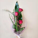 Este arreglo floral minimalista combina la pasión de tres rosas rojas con un toque de naturaleza gracias a su follaje fresco y detalles de eucalipto y flores silvestres. Envuelto en una malla lila delicada, este diseño moderno y sofisticado es ideal para expresar amor y admiración en cualquier ocasión especial. Perfecto para quienes aprecian la sencillez llena de estilo y la belleza natural en cada detalle. ¡Un regalo elegante que deja huella en el corazón! Ramo en forma vertical compuesto de rosa roja ,un diseño muy demandado para ocasiones muy especiales expresar pasión, amor felicidad,sorpresa