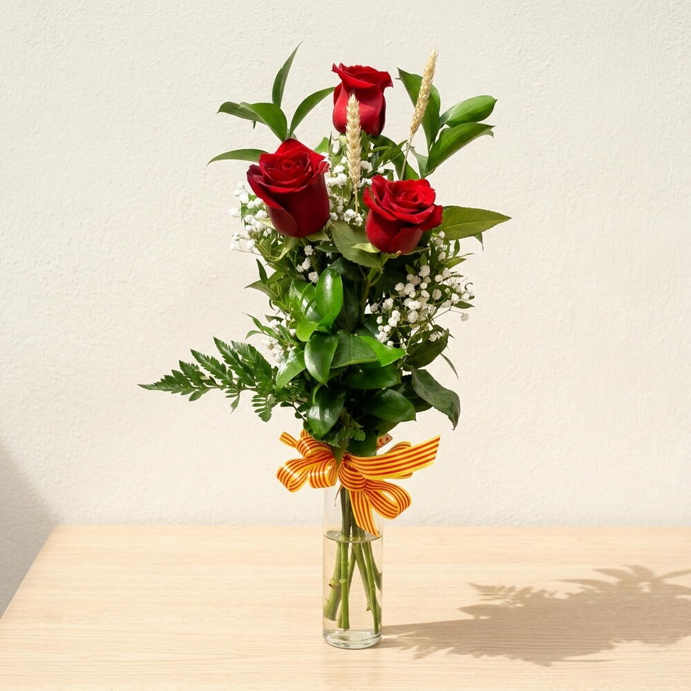Este encantador bouquet de la categoría De autor, compuesto por tres unidades de Ruscus, tres rosas rojas, una unidad de paniculata blanca, dos espigas de trigo y adornado con una cinta catalán, crea un estallido de color y elegancia. Perfecto para cualquier ocasión, este bouquet inspira amor, pasión y admiración por su singular mezcla de elementos. Con un toque de elegancia y un aire de sofisticación, éste es un regalo verdaderamente excepcional para transmitir tus sentimientos más profundos.