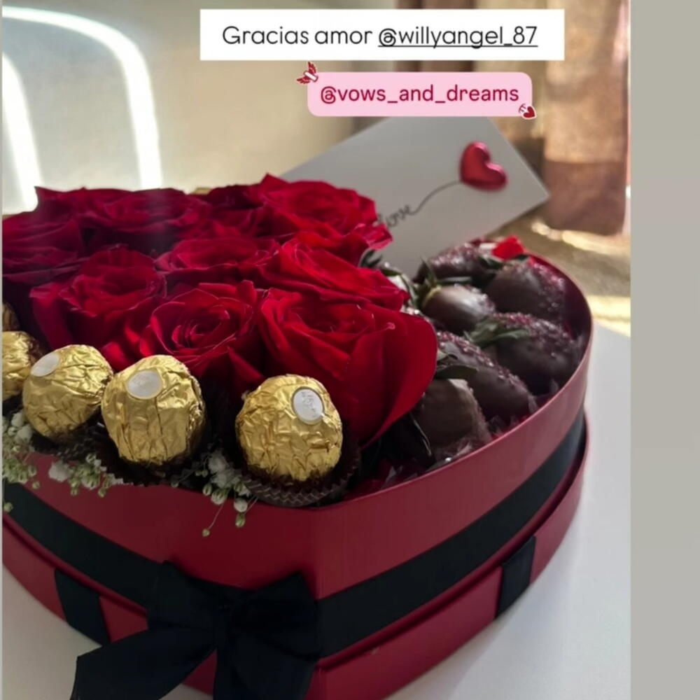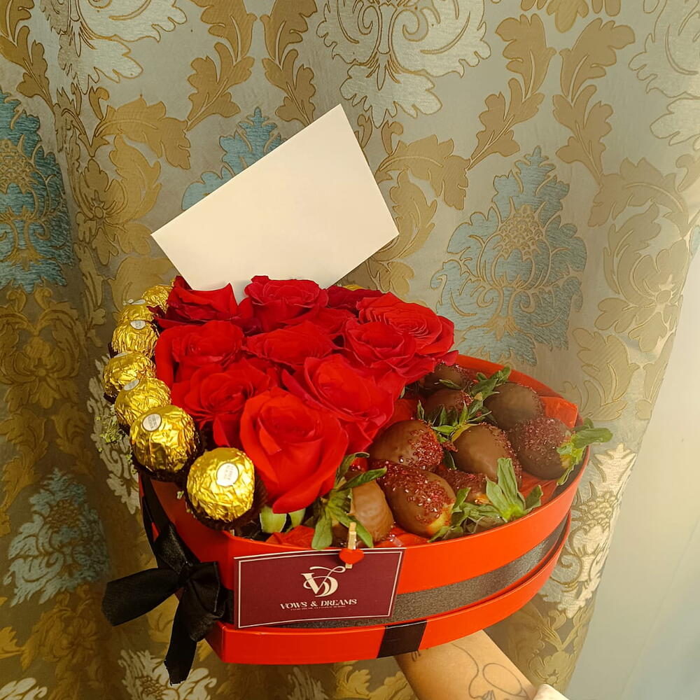 Enamora con esta hermosa caja de flores que incluye 9 brillantes rosas rojas, símbolo duradero de pasión y amor. Acompañadas con 11 exquisitas fresas cubiertas de chocolate, que aportan un perfecto contraste de sabor y color. También incluye 12 deliciosos chocolates Ferrero Rocher, que harán de esta caja un verdadero tesoro de sabores. Está dispuesto todo con esmero y cuidado para brindar una sensación de lujo y elegancia. Este regalo es una verdadera delicia para los ojos y el paladar.