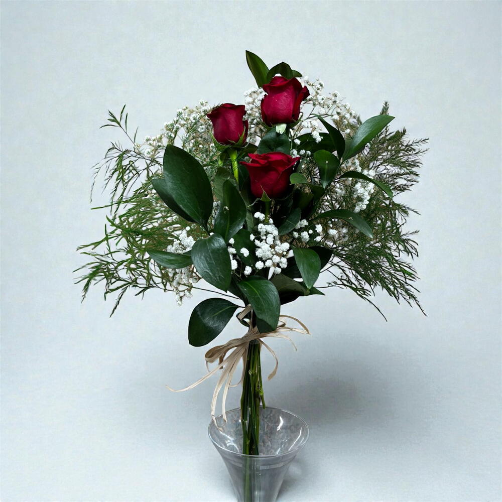 Ruscus - 3 ud. rosa roja - 3 ud. treefer - 2 ud. paño culata blanca - 2 ud.