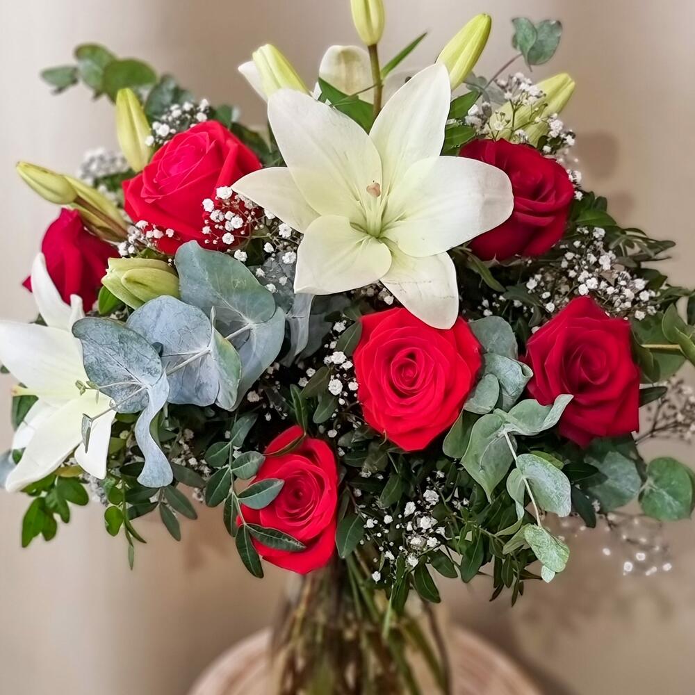 Un ramo sofisticado que combina la pureza de los lirios blancos con la pasión de las rosas rojas, complentado con eucalipto fresco y toques delicados de paniculata