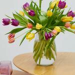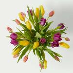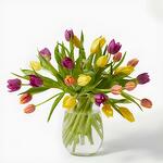 Alegra la casa de tu ser querido con este vibrante ramo de 30 tallos, incluyendo tulipanes en tonos vibrantes. Estas flores, símbolo de la primavera, destacan por su forma casi perfectamente simétrica.