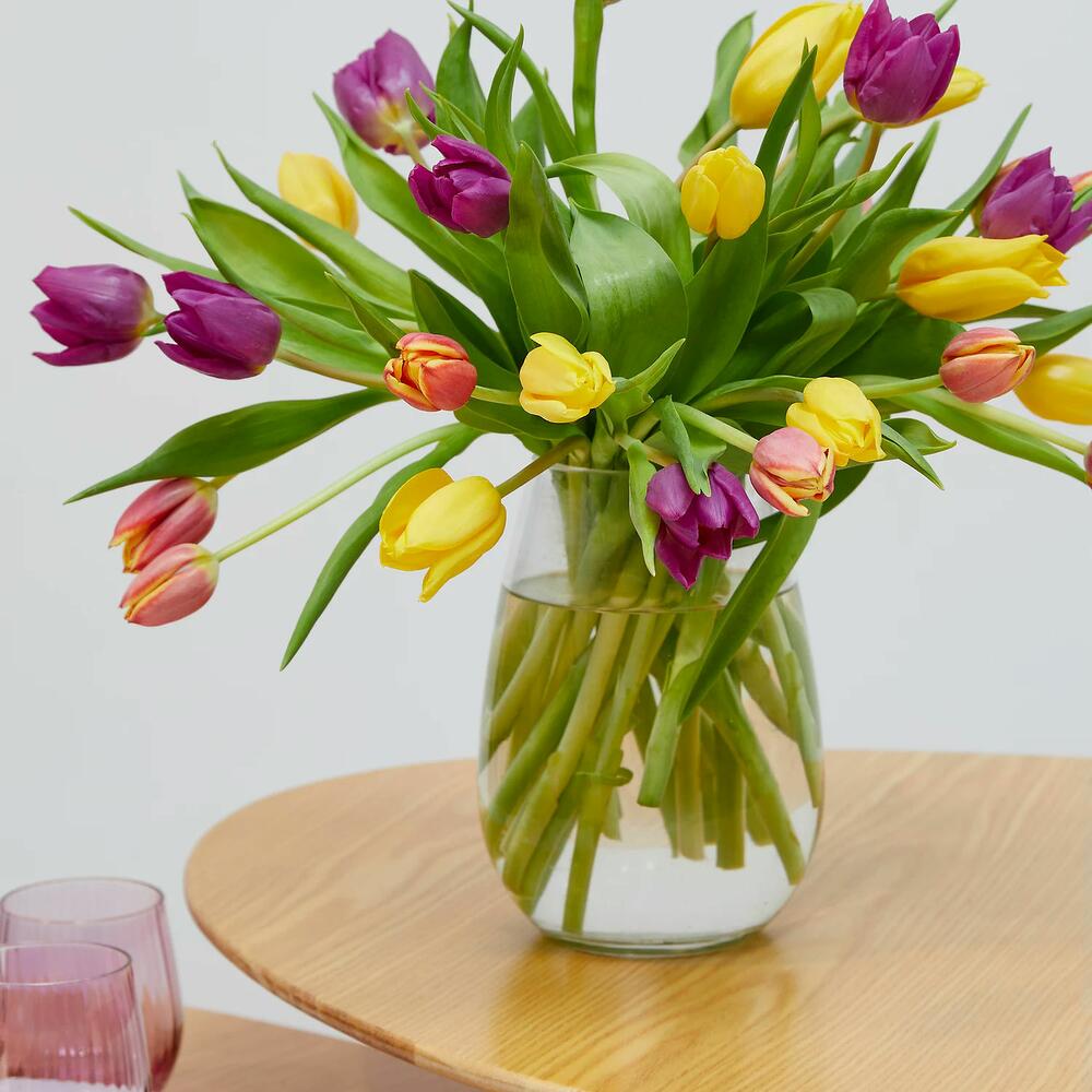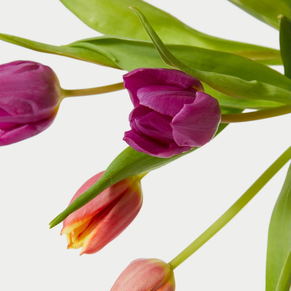 Alegra la casa de tu ser querido con este vibrante ramo de 30 tallos, incluyendo tulipanes en tonos vibrantes. Estas flores, símbolo de la primavera, destacan por su forma casi perfectamente simétrica.
