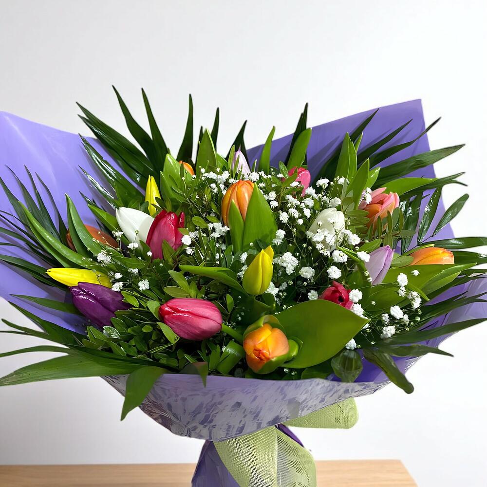 Este hermoso y vibrante ramo de tulipanes de colores simboliza alegría, vitalidad y optimismo. Las distintas tonalidades crean una composición dinámica y llamativa, perfecta para alegrar cualquier ambiente. La combinación de flores y follaje aporta frescura y armonía, convirtiéndolo en un regalo ideal para cualquier ocasión.