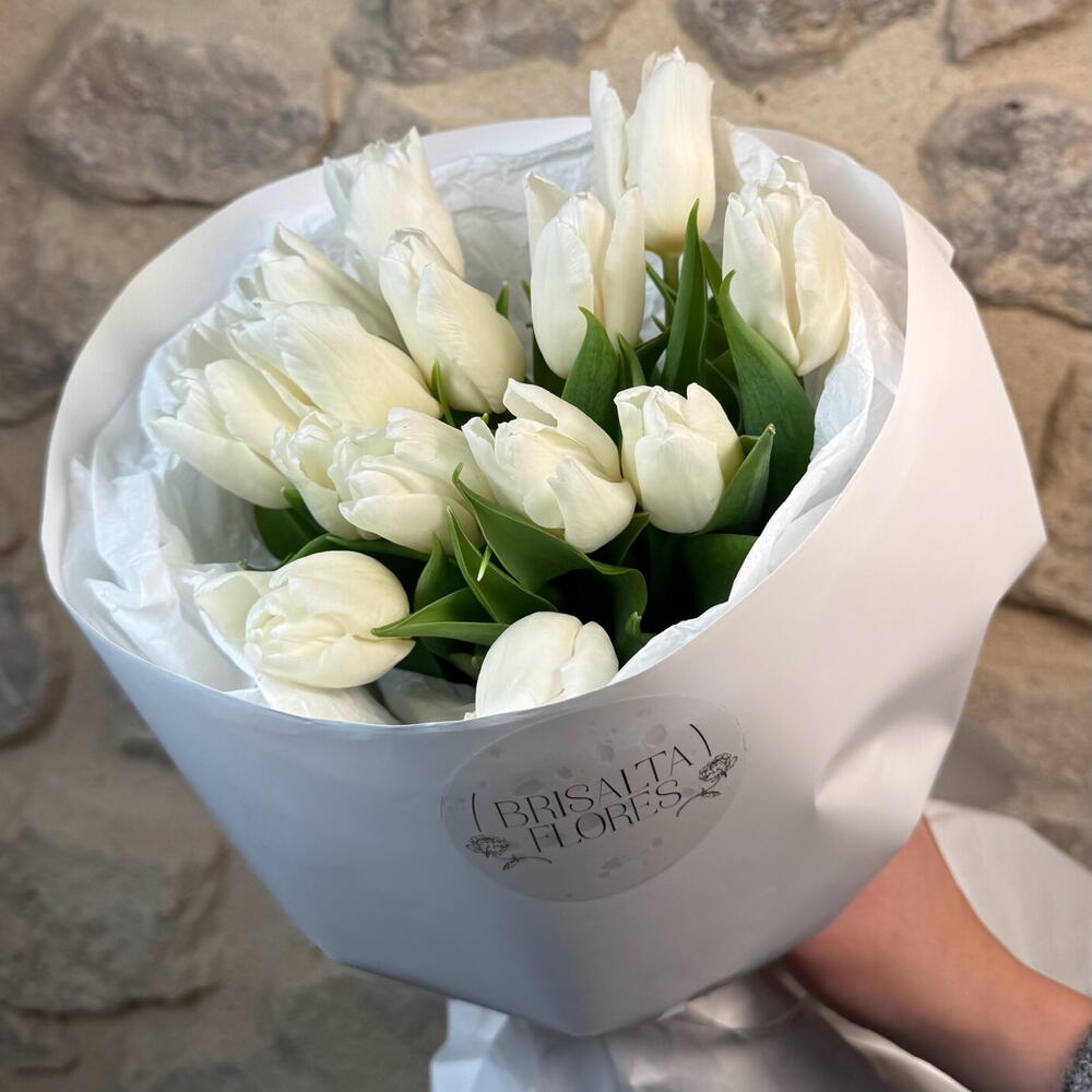 Ramo de 15 tulipanes blancos Un ramo elegante y delicado de 15 tulipanes blancos, símbolo de pureza, amor sincero y buenos sentimientos. Su estética minimalista lo convierte en un regalo perfecto para sorprender en San Valentín o en cualquier ocasión especial. Flores frescas de temporada, cuidadosamente seleccionadas y envueltas en un diseño elegante.