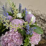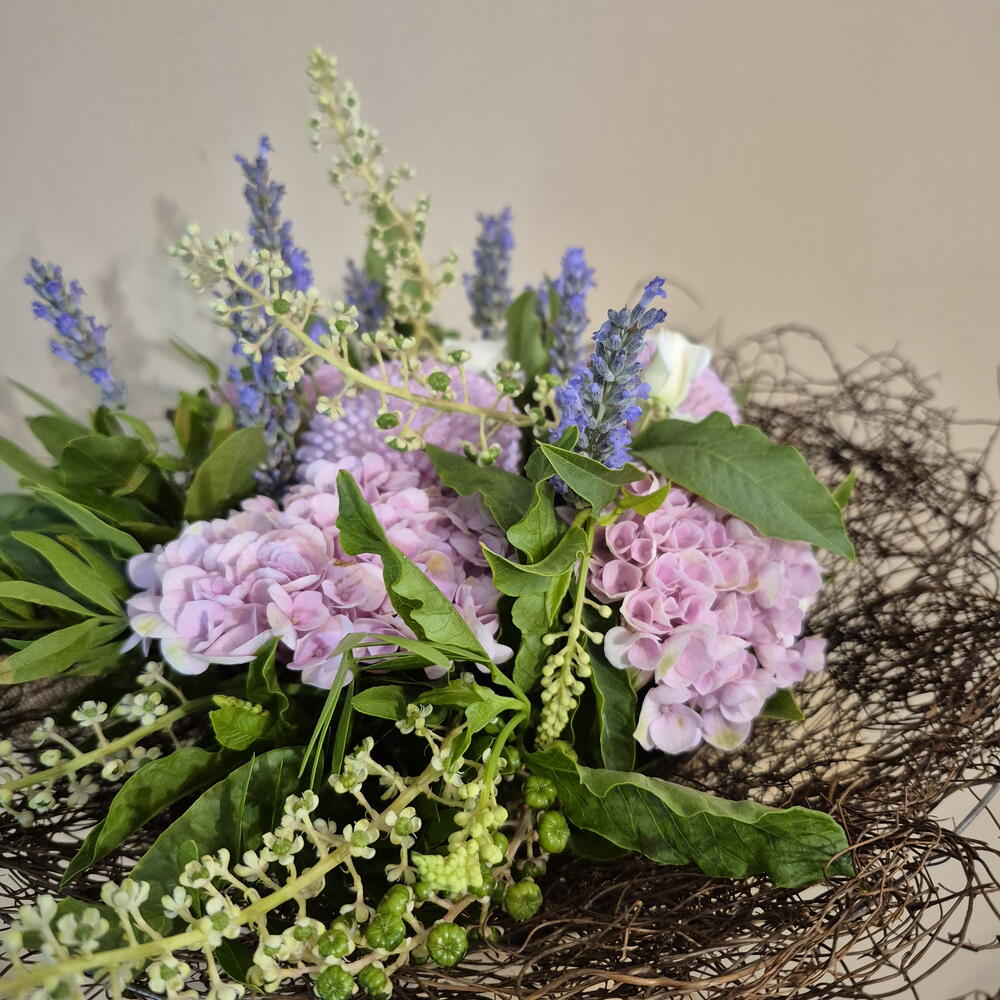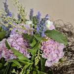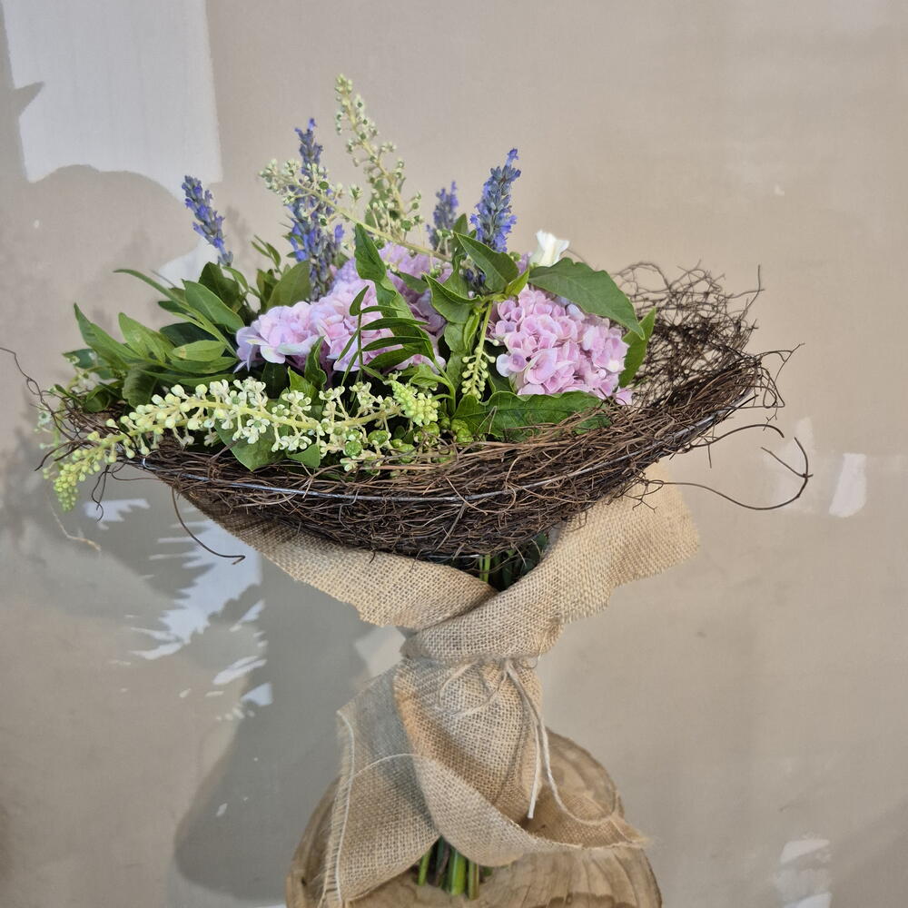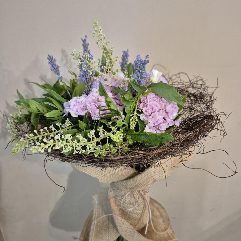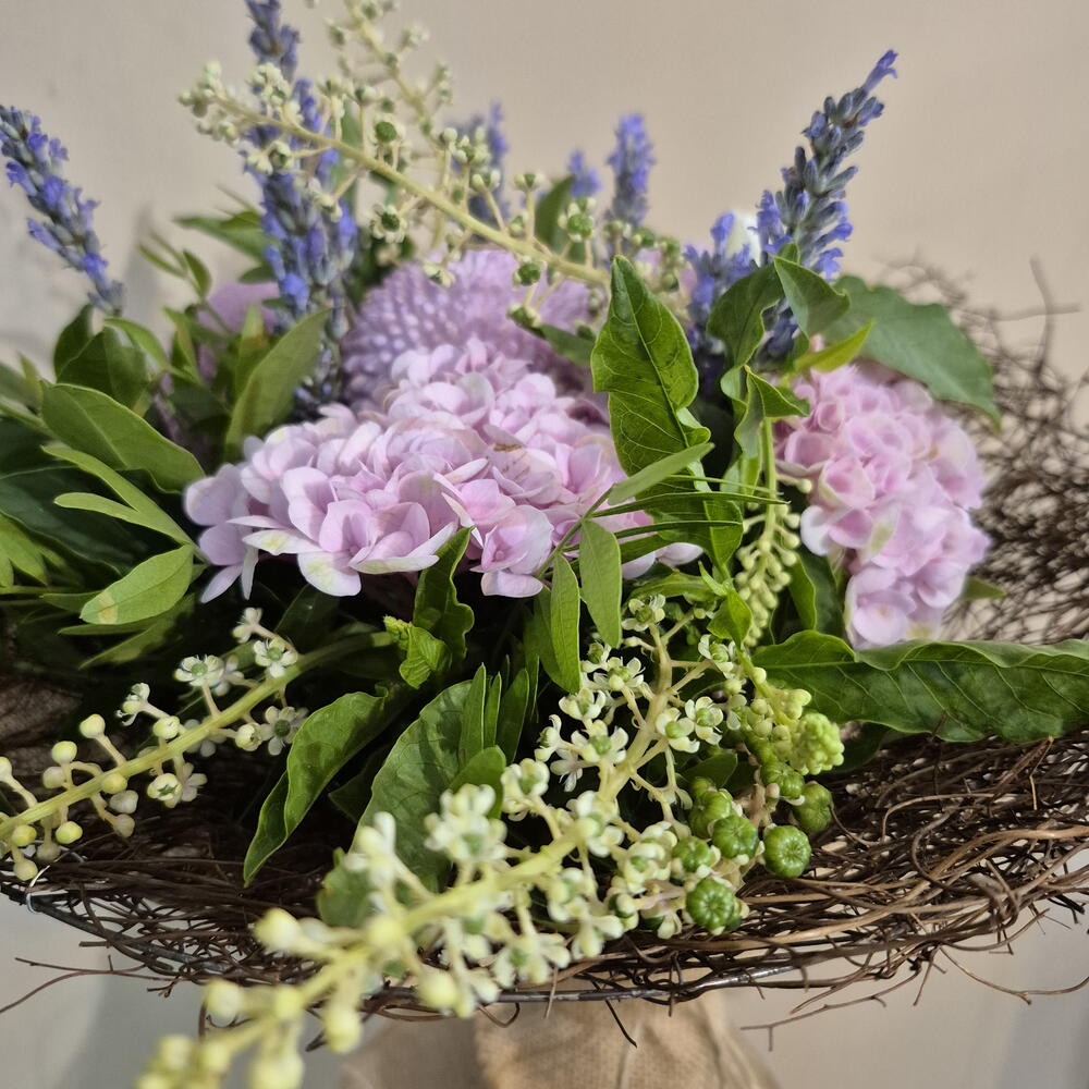 hortencia - 3 ud. estructura nido - 1 ud. tela saco - 1 ud. pompon chrisanthemum - 3 ud. rama ramificada rosa - 2 ud. flor lavanda - 14 ud. lentrisco - 3 ud. rama de uva silvestre - 5 ud.