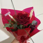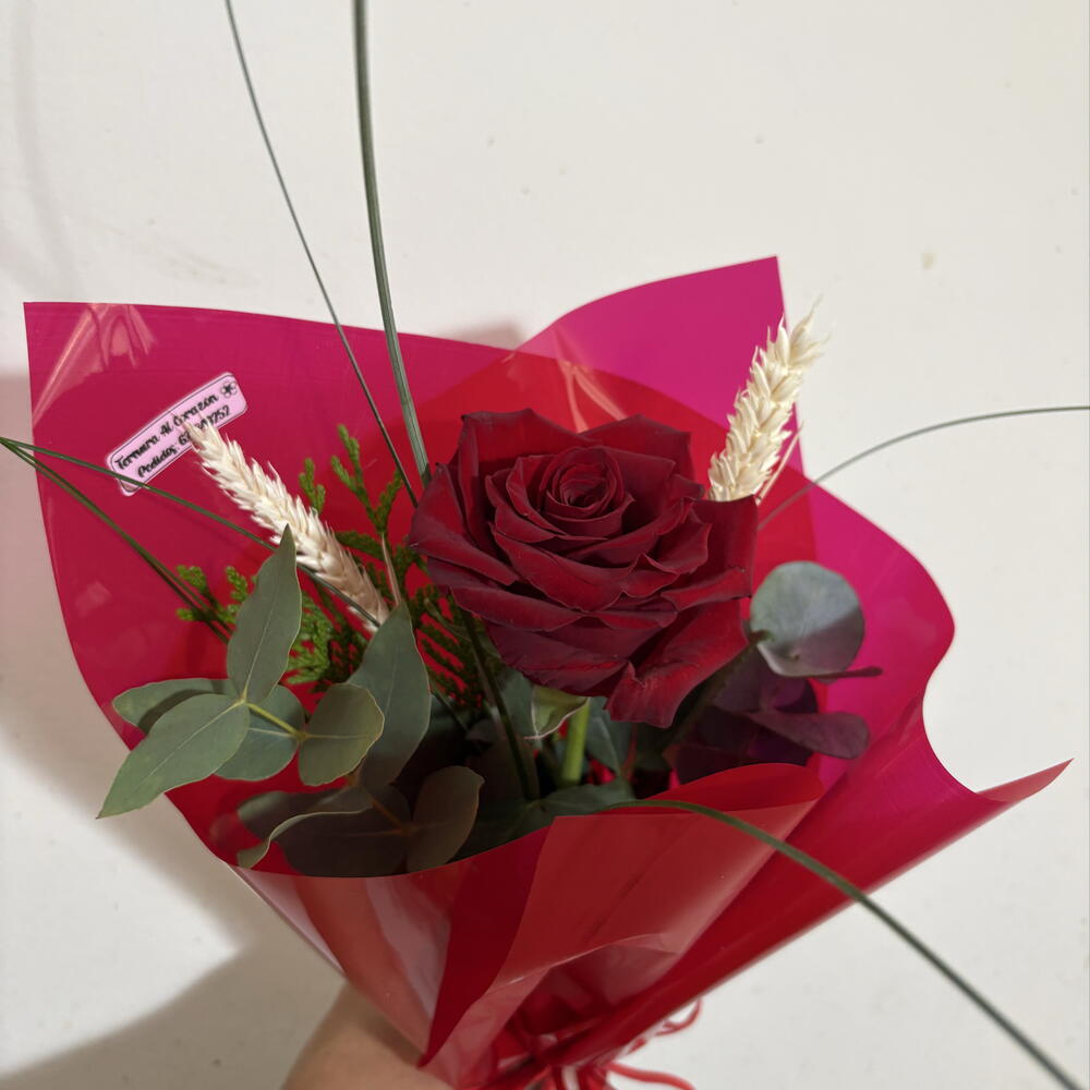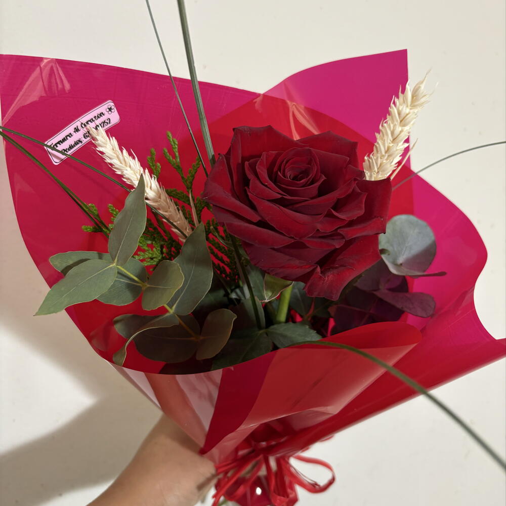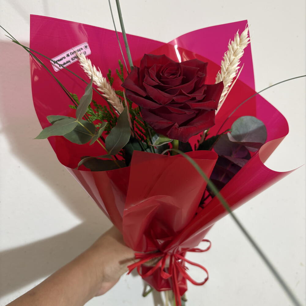 Rosa roja natural de gran intensidad, acompañada de eucalipto y detalles secos que aportan textura y elegancia. Presentada en envoltorio rojo vibrante con lazo a juego. Un detalle clásico y sofisticado para sorprender en Sant Jordi.