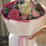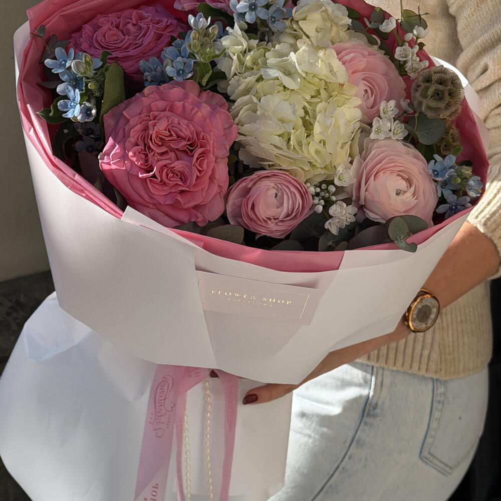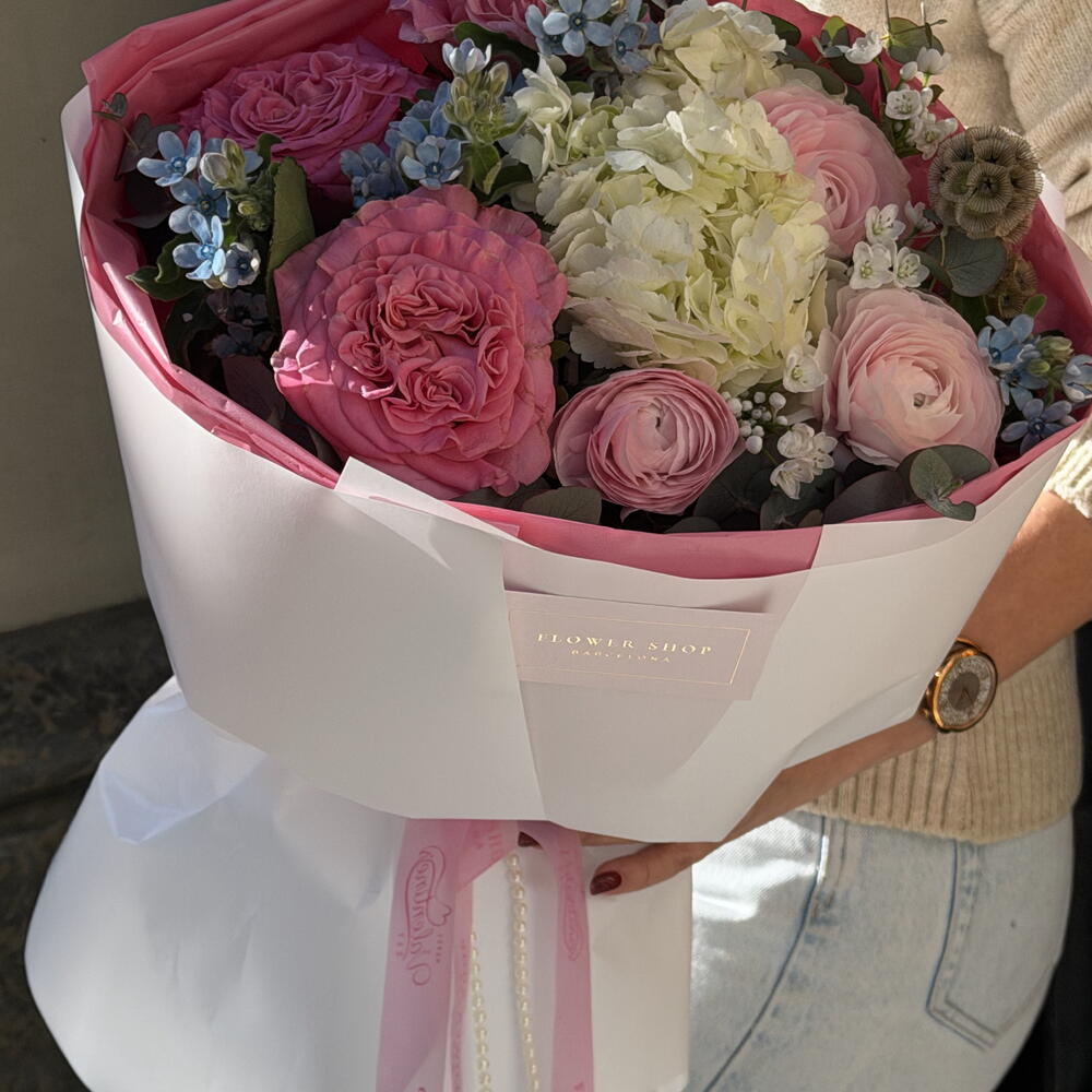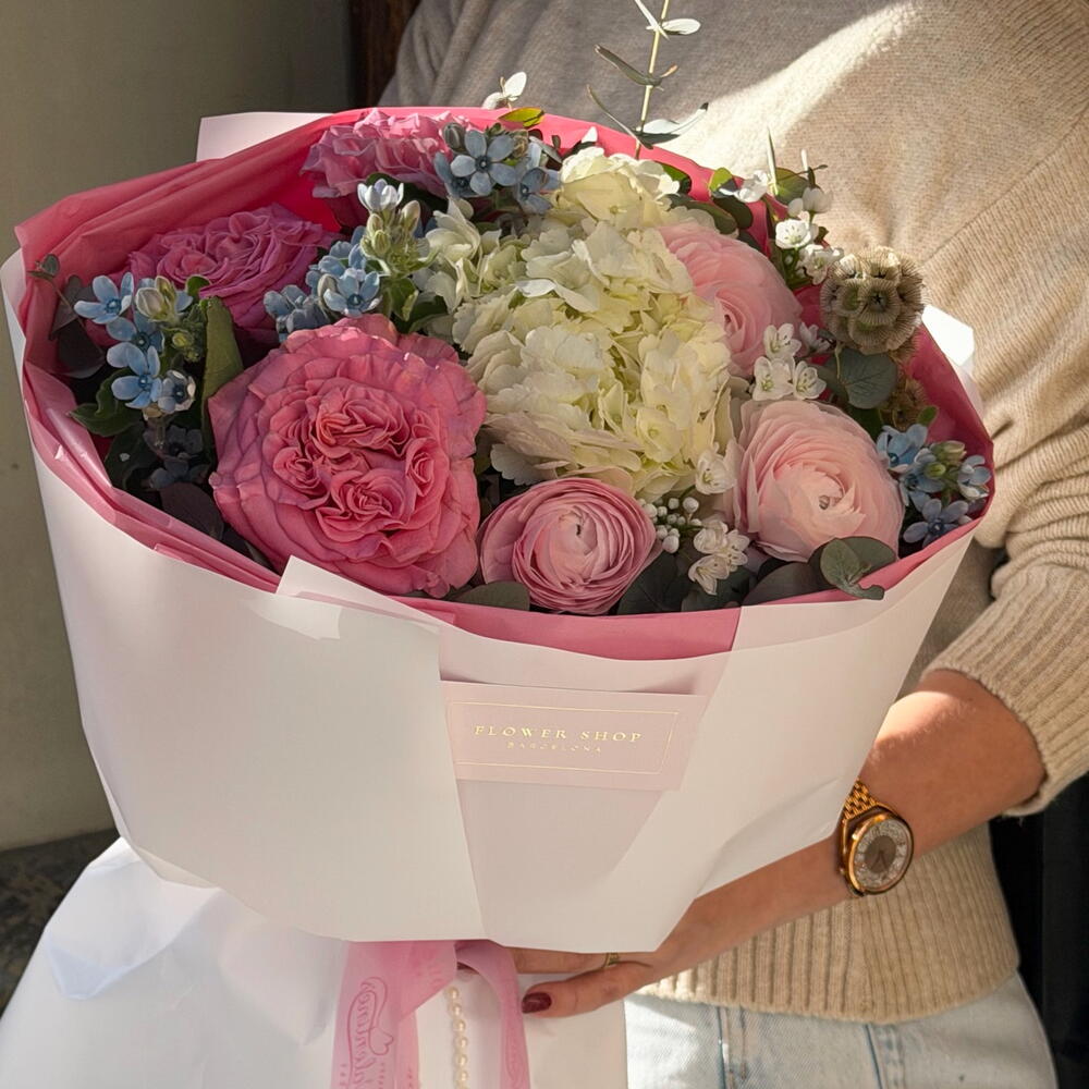 hortensia - 1 ud. eucalipto - 2 ud. oxypetalum - 4 ud. allium - 3 ud. ranúnculos - 3 ud. rosa premium - 3 ud.