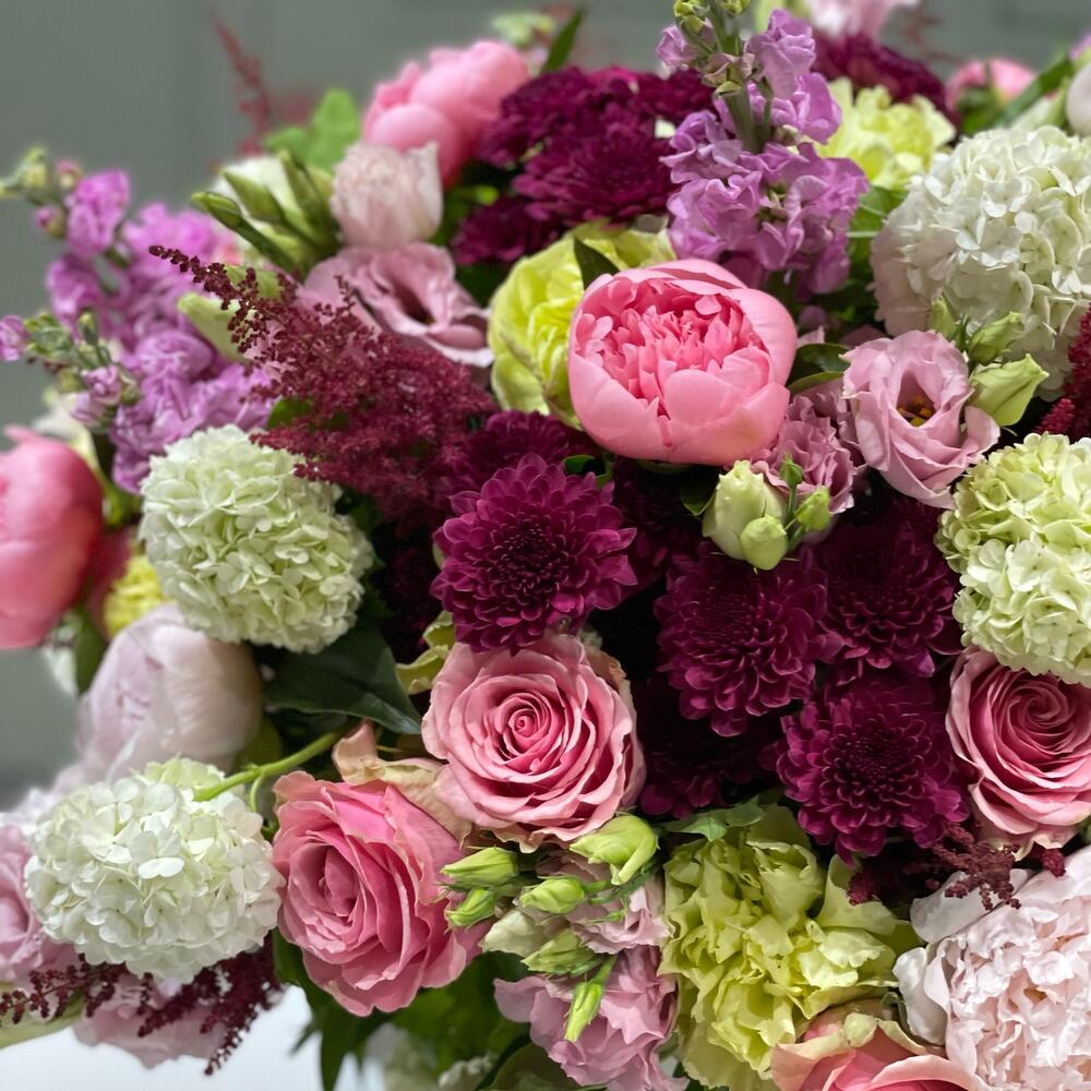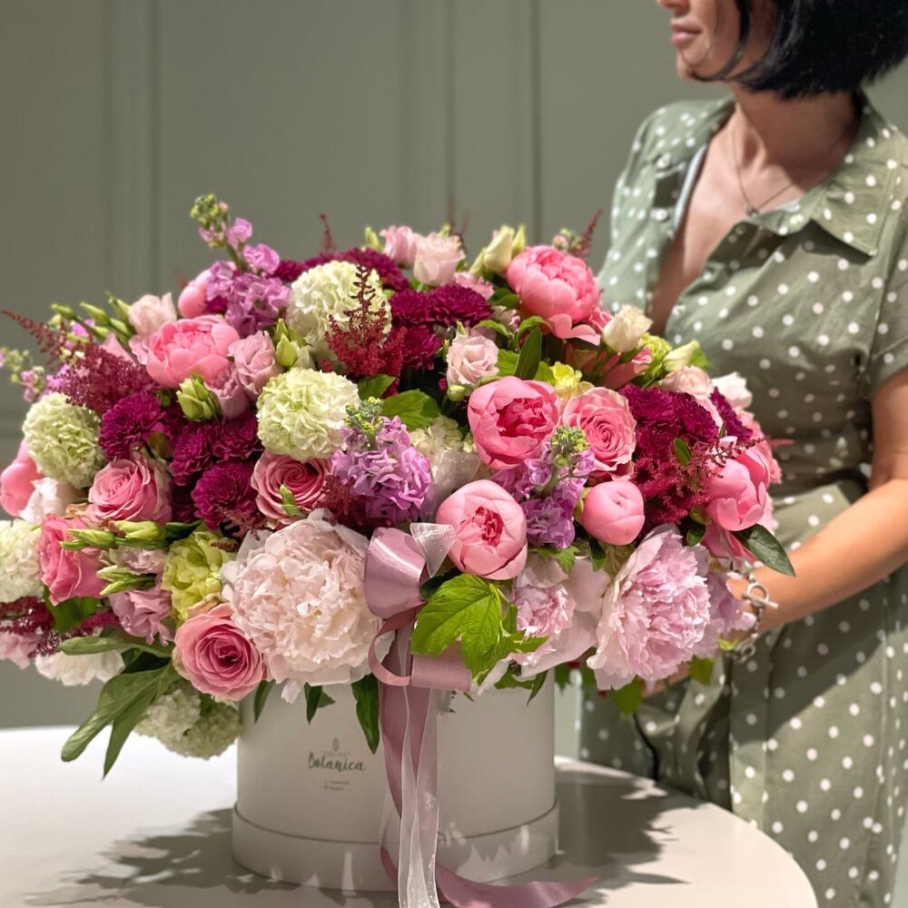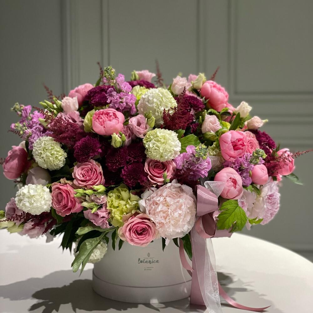 Box - 1 ud. Viburnum - 10 ud. Lisianthus - 20 ud. astilbe - 10 ud. rosa - 20 ud. peonias o hortensias - 20 ud. chrisantemo - 10 ud. matiola o tulipanes - 10 ud.