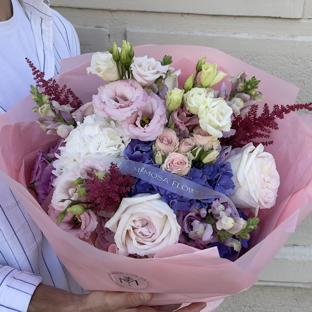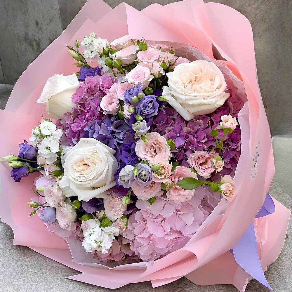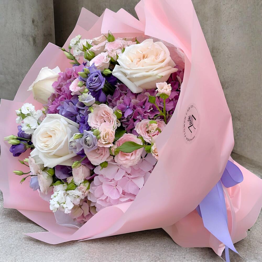 Este encantador ramo combina la elegancia de las rosas blancas y rosadas con la suavidad de las hortensias en tonos lilas y pastel. Detalles de lisianthus y flores delicadas en color violeta y blanco añaden un toque sofisticado. Diseñado en un envoltorio rosado suave, este ramo es perfecto para expresar amor, admiración o gratitud en ocasiones especiales. Su estética romántica y fresca iluminará cualquier momento.