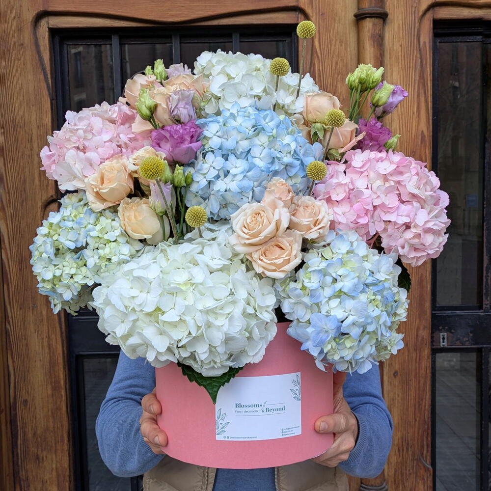 Este exquisito arreglo floral transporta a un jardín encantado, donde la naturaleza se expresa en su forma más delicada y armoniosa. Su diseño evoca la magia de los paisajes florales, llenando cualquier espacio de frescura y serenidad.