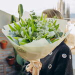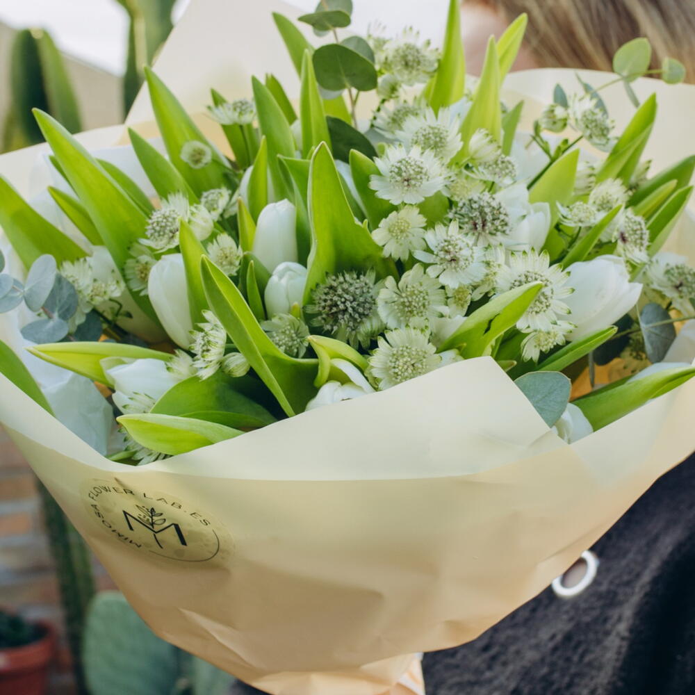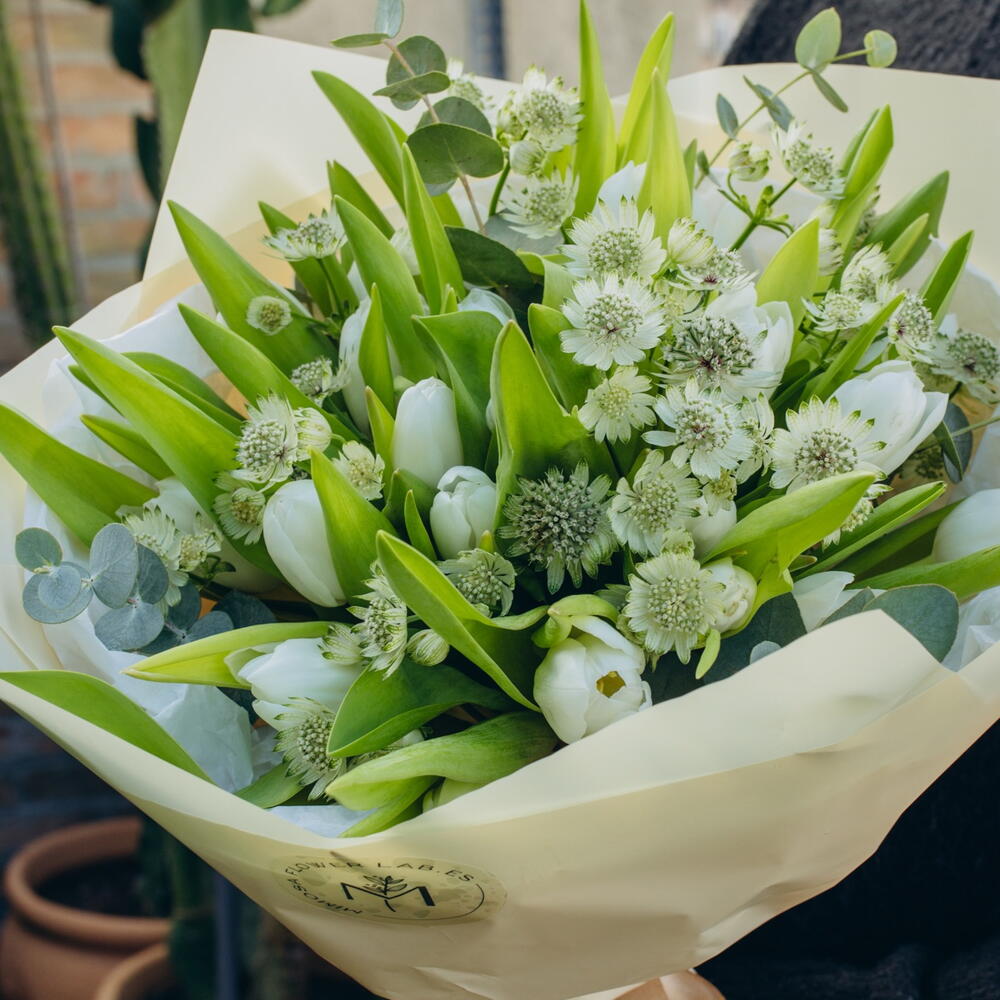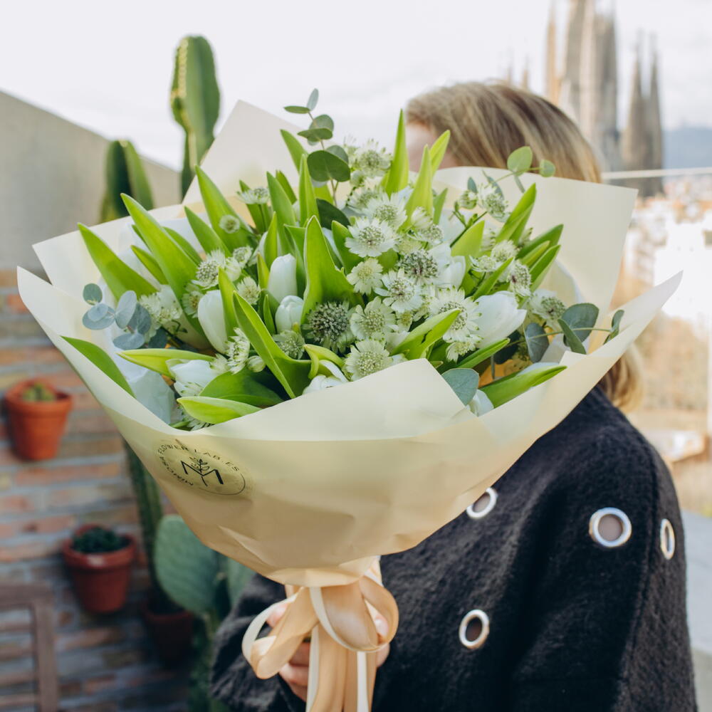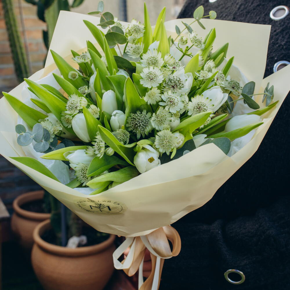 Astrantia - 10 ud. Eucalyptus - 6 ud. white tulips - 25 ud.