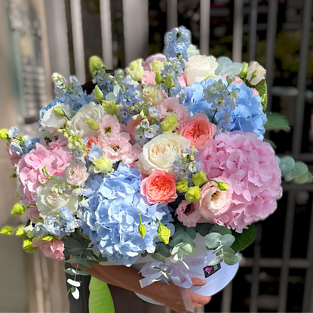 El eucalipto - 10 ud. Эустома - 10 ud. mezcla de rosas - 15 ud. hortensias rosas - 5 ud. hortensias azules - 5 ud.