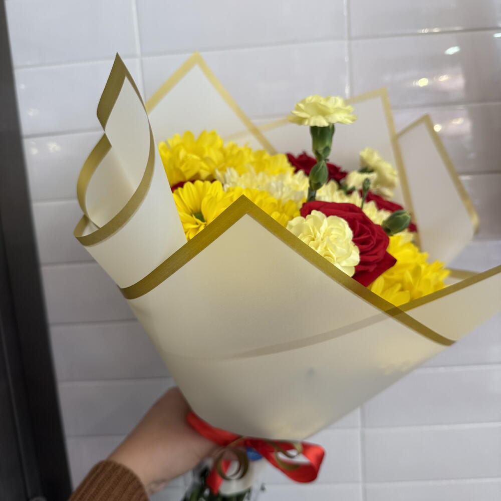 rosas - 4 ud. verdes varios - 3 ud. clavelinas - 3 ud. margaritas multiflor - 4 ud. papel y cintas decorativas - 2 ud.