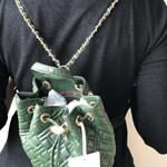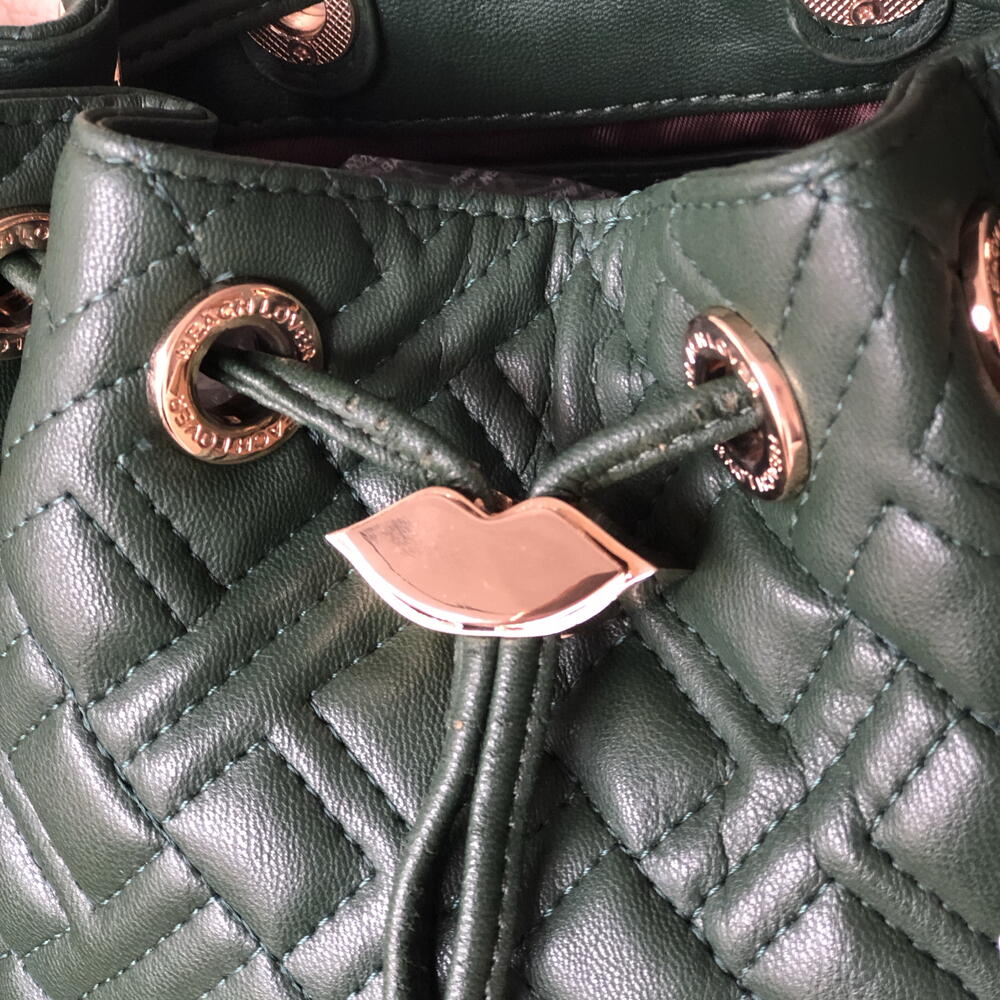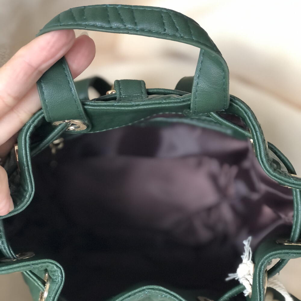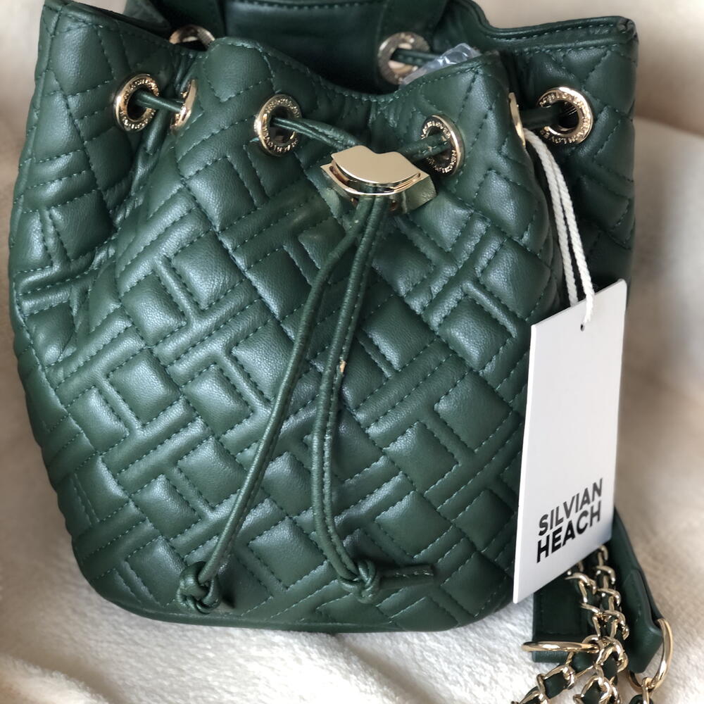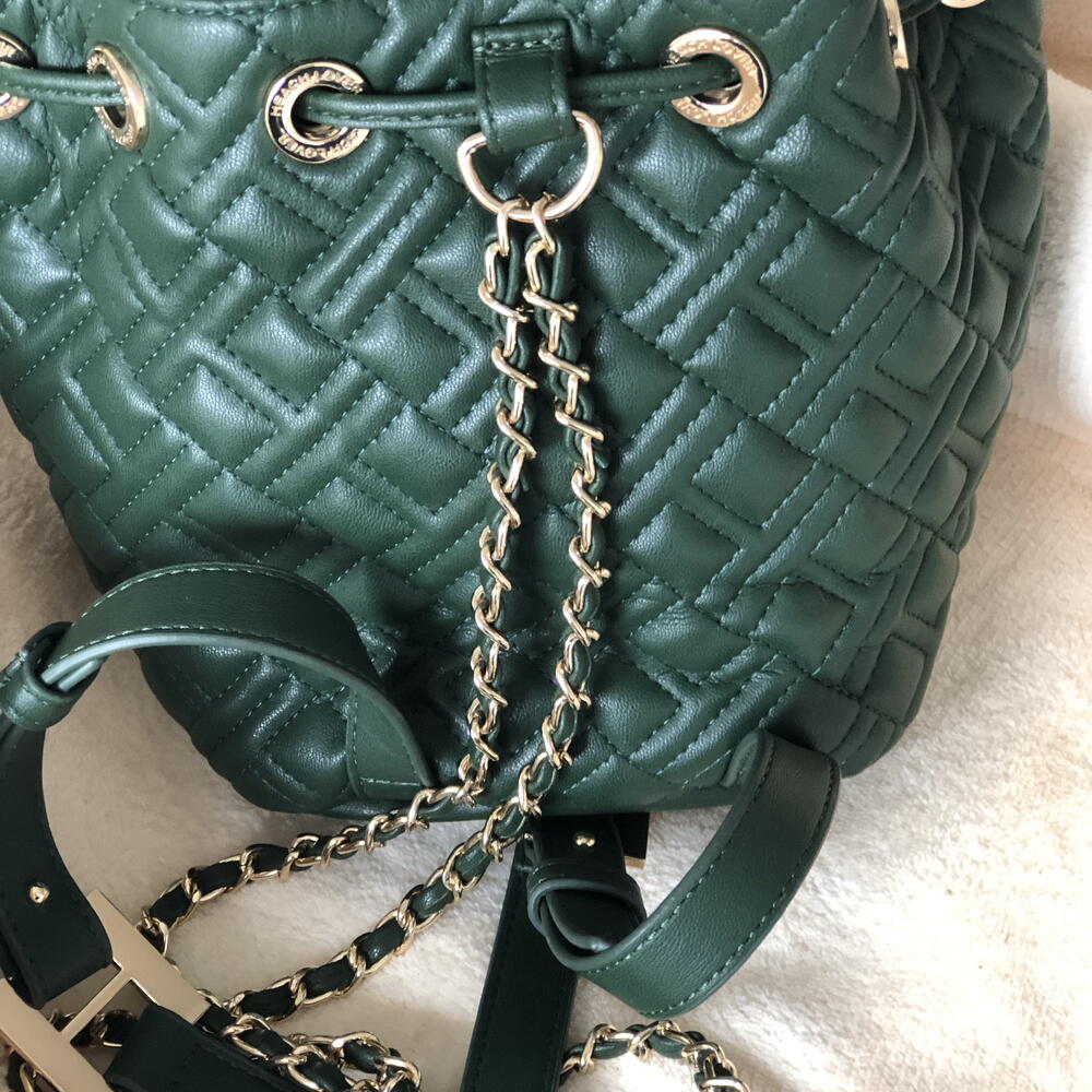 Sac à dos vert kaki, marque Silvian Heach, pendentifs sur chaîne dorée. Design matelassé, fermeture à cordon.
