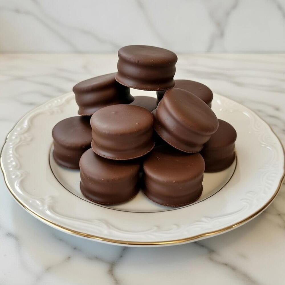Biscuit au chocolat, fourré à la confiture de lait pour pâtisserie, enrobé de chocolat mi-amer.
