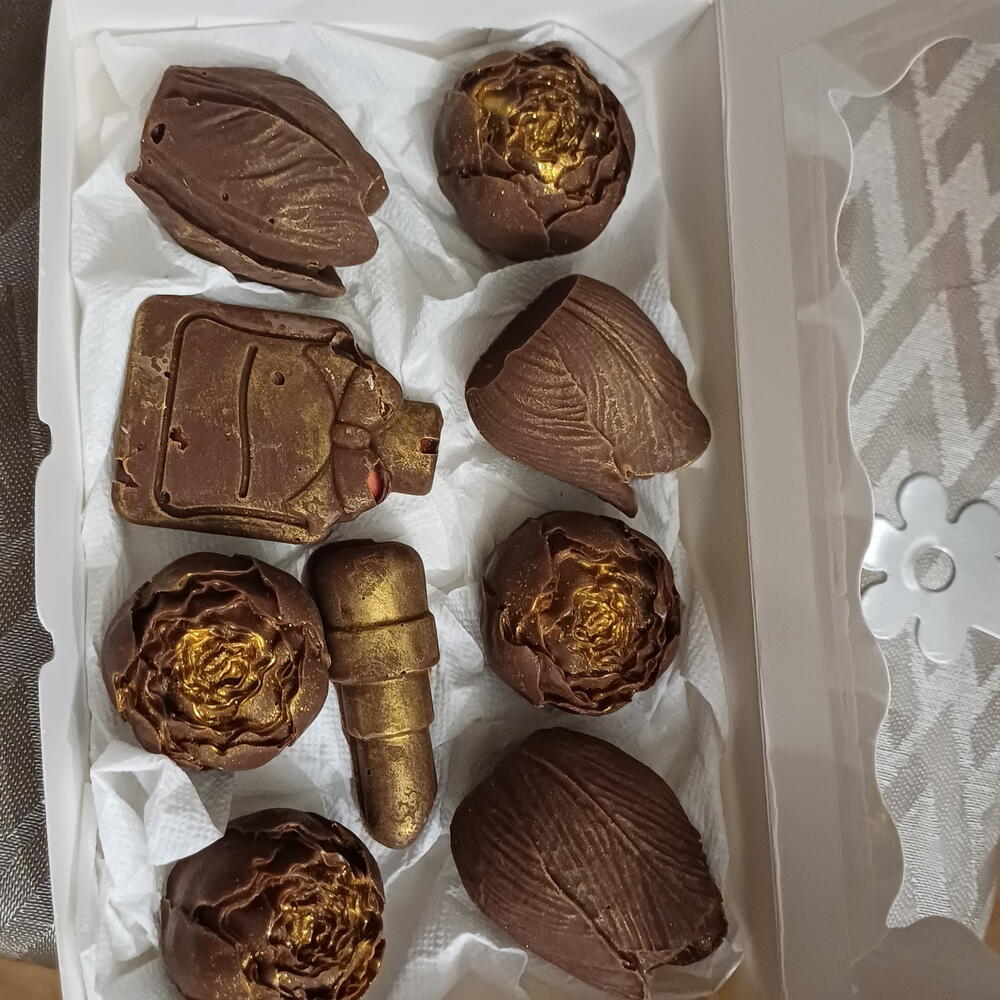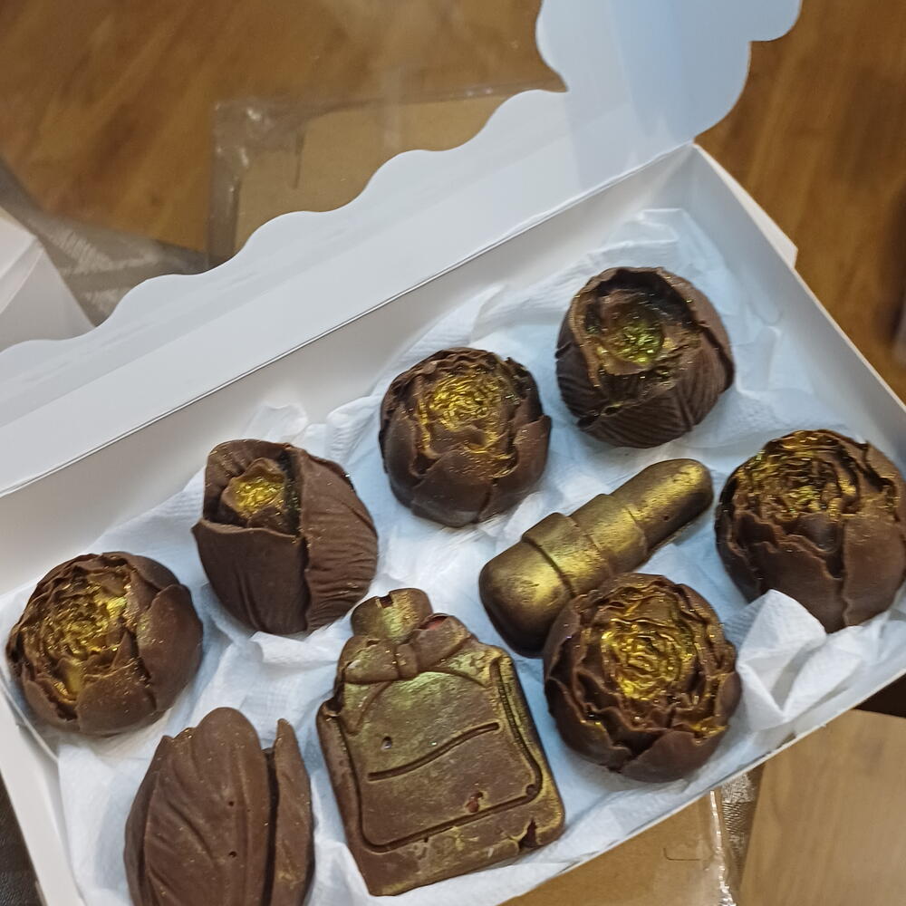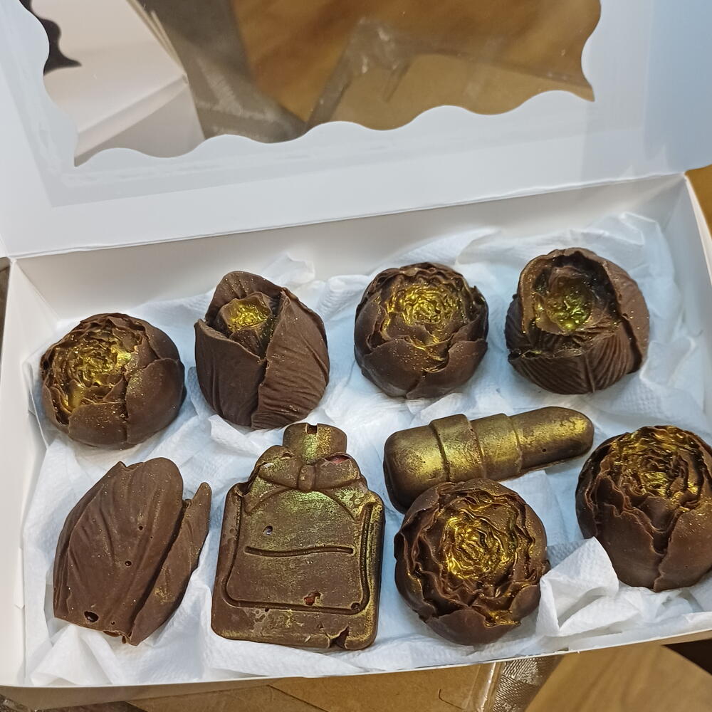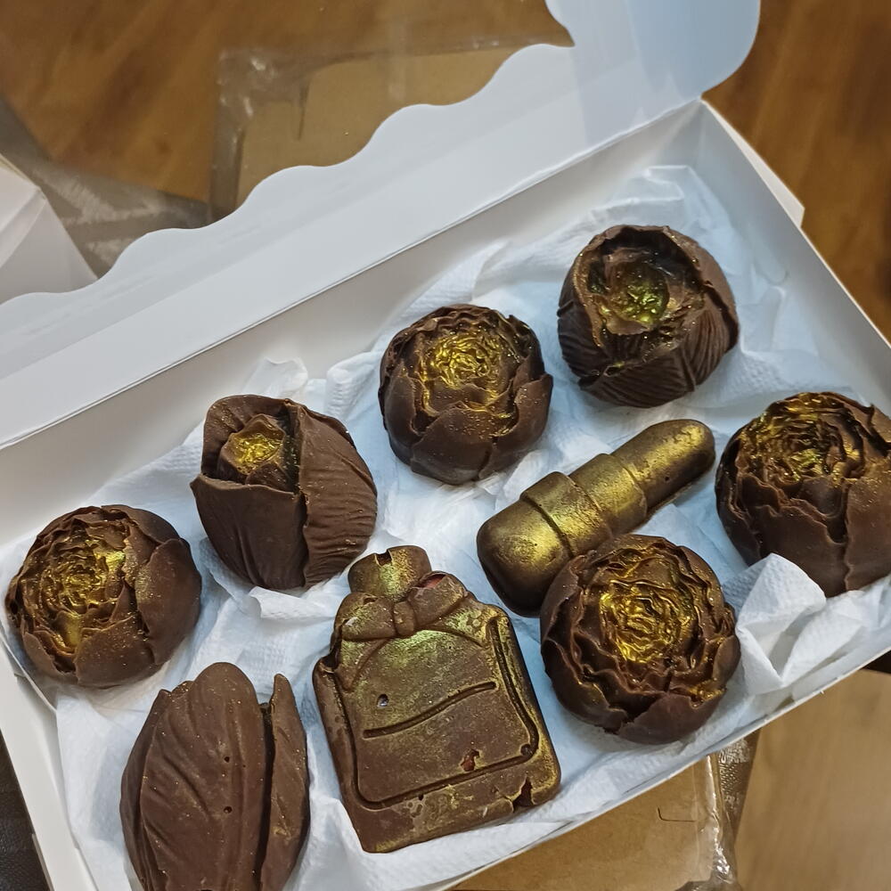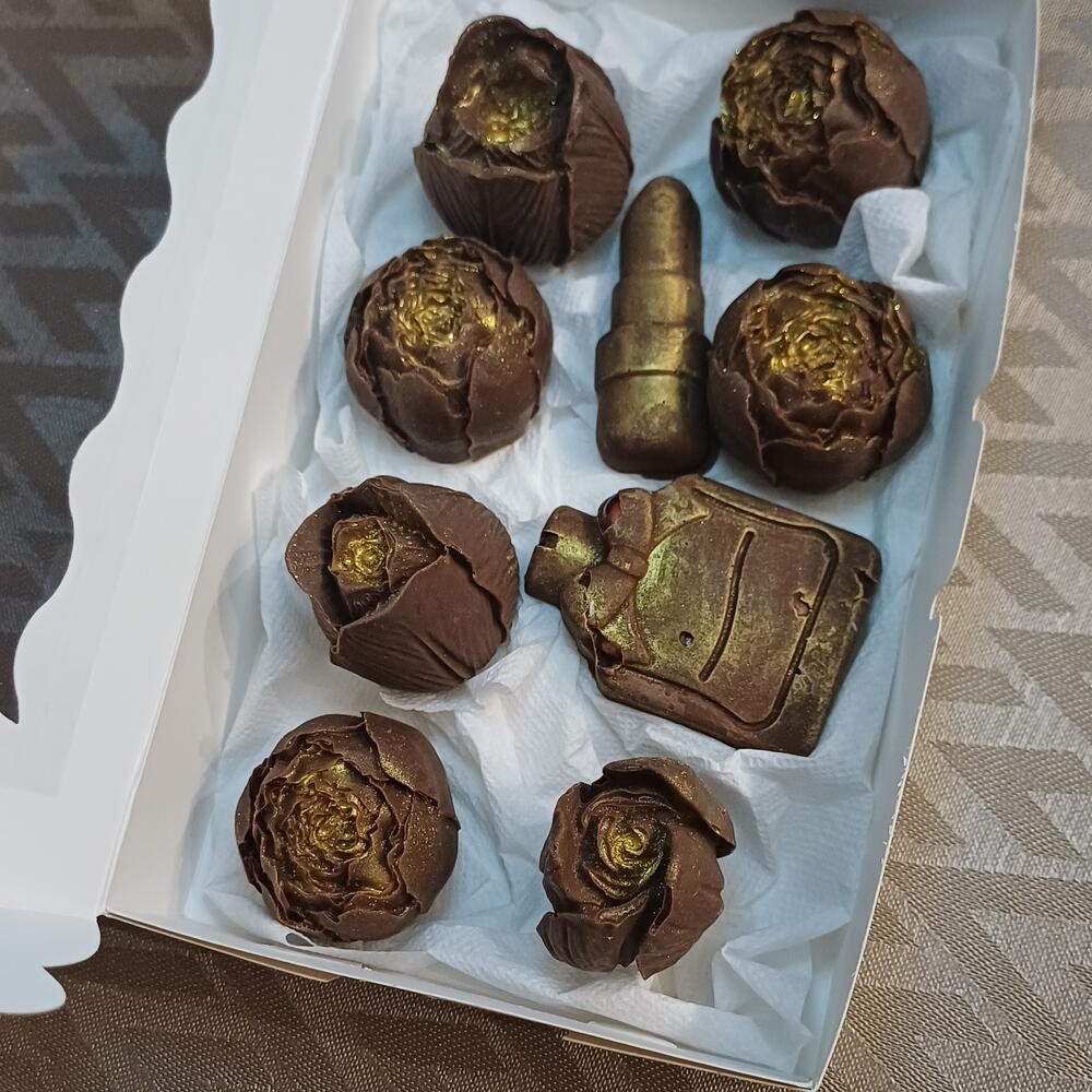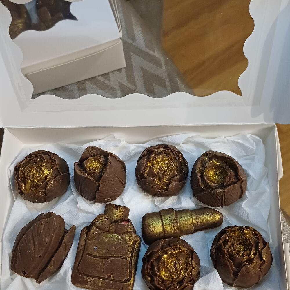Élégante sélection de chocolats artisanaux fabriqués à la main, avec des designs uniques qui transforment chaque pièce en une petite œuvre d'art. Comprend des formes originales de roses, parfum et rouge à lèvres, créant une combinaison parfaite entre douceur et style. 💛 Chocolat de haute qualité au goût doux et délicieux 🌹 Designs exclusifs: roses, parfum et rouge à lèvres ✨ Finition décorative avec effet doré 🎁 Présentation soignée, idéale pour un cadeau Parfait pour surprendre lors d'anniversaires, de célébrations ou simplement pour profiter d'un petit plaisir spécial.