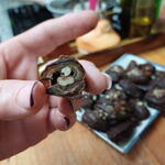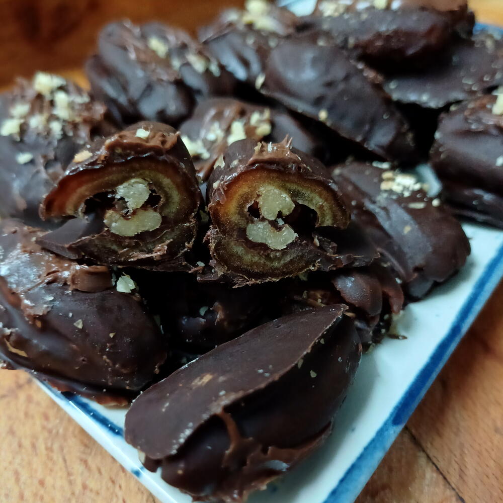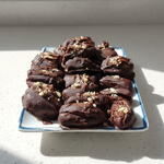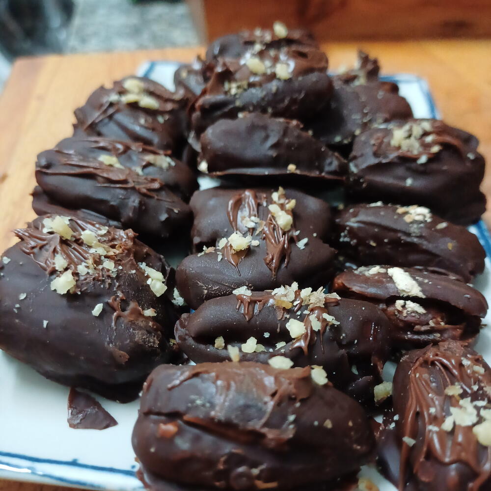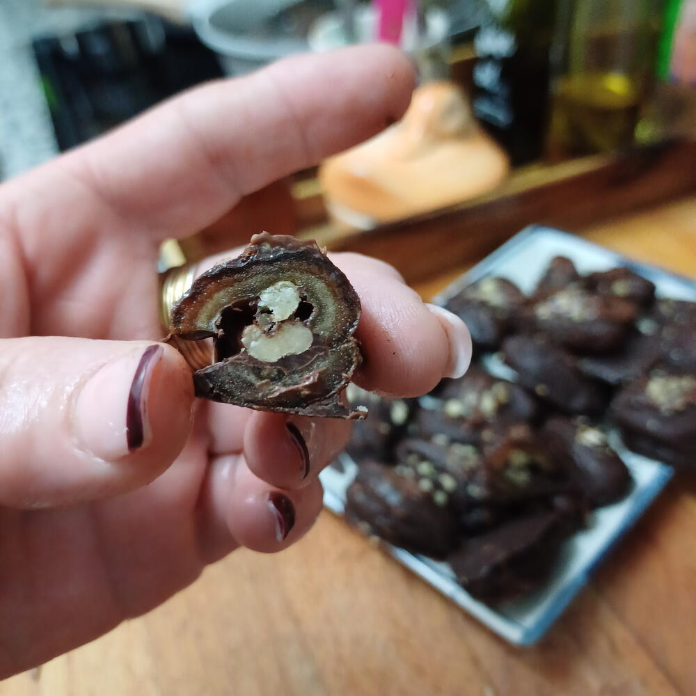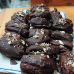 Dattes fourrées aux noix et au beurre de cacahuète, enrobées de chocolat noir. (2 € la datte)