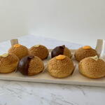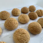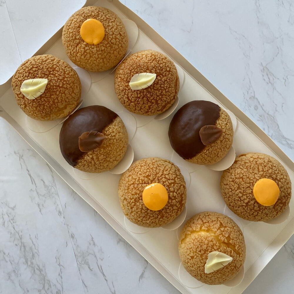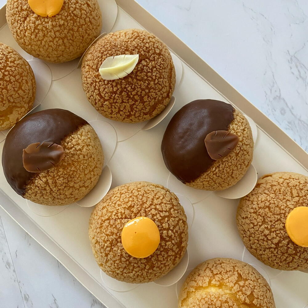 Classiques profiteroles recouverts de craquelin : croustillants à l'extérieur, moelleux et aérés à l'intérieur. Garnis d'une crème délicate (vanille, chocolat, pistache ou mangue-passion), ils deviennent un dessert élégant et absolument irrésistible.
