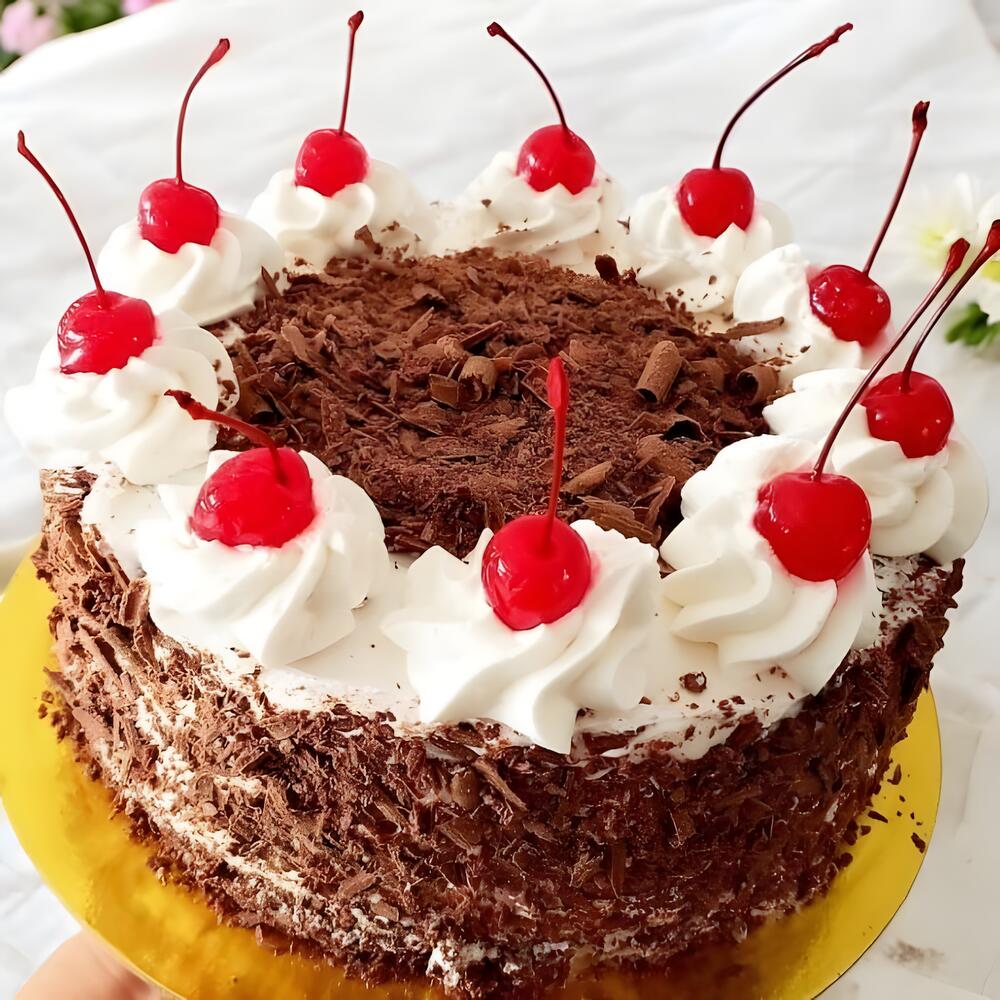 La Forêt-Noire classique est un dessert gourmand, avec des couches de gâteau moelleux au chocolat garnies de crème fouettée et de sirop de cerise. Décorée de copeaux de chocolat noir et couronnée de cerises rouges brillantes, ce gâteau est une option parfaite pour les amateurs de chocolat et de fruits. Sa présentation élégante et son goût irrésistible en font un choix idéal pour des célébrations spéciales ou comme une douceur gourmande en toute occasion.
