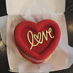 Gâteau individuel en forme de cœur, recouvert d’une finition effet velours de couleur rouge intense. La surface présente une texture mate et uniforme, avec un léger relief qui souligne le contour du cœur. Au centre se détache le mot “love” en chocolat blanc, apportant un contraste élégant et romantique. C’est un design minimaliste et sophistiqué, idéal pour la Saint-Valentin, les anniversaires ou des cadeaux romantiques.