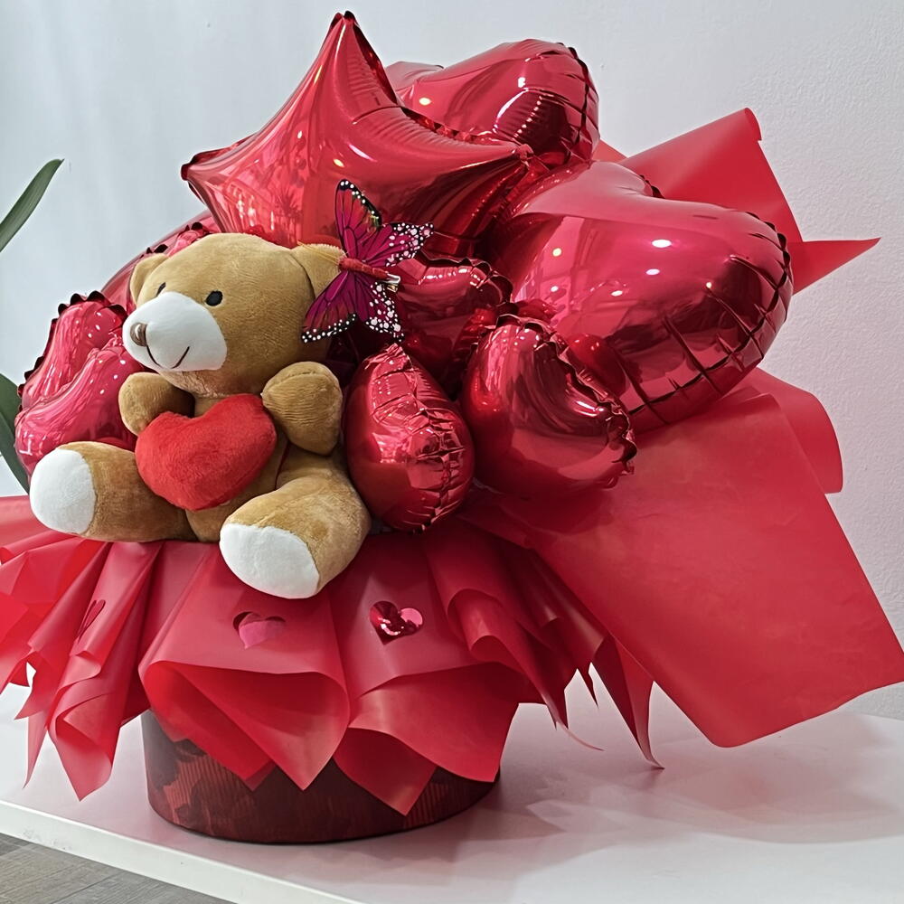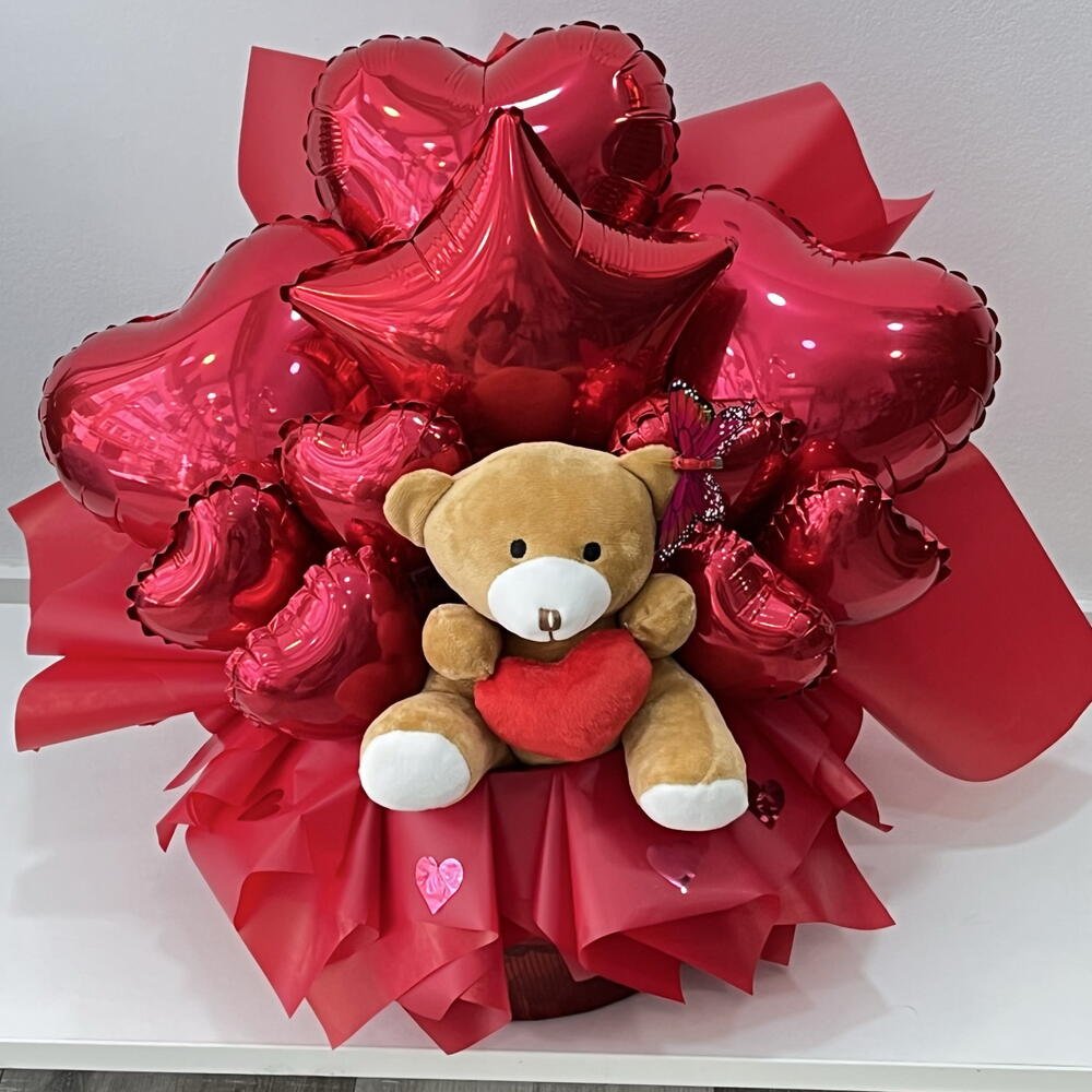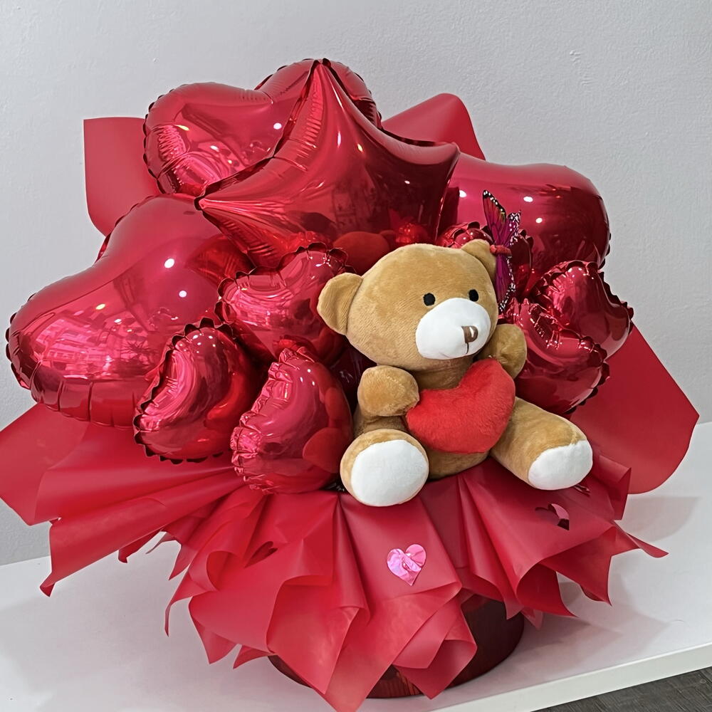composición con globos foil rojos en forma de estrellas y corazones, acompañados de un tierno osito de peluche. Globos de alta calidad, fabricación española. El regalo perfecto para sorprender y enamorar.❤️🎈🧸
