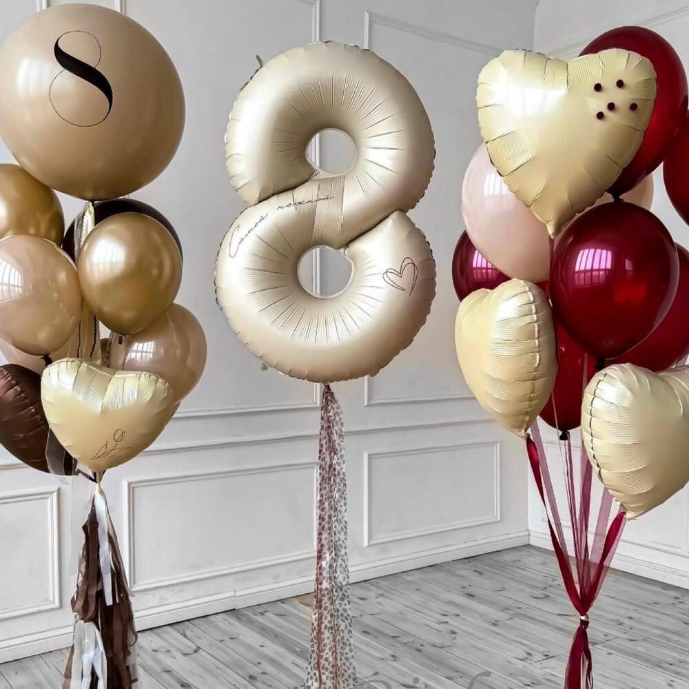 - Ballon à l'hélium en forme du chiffre 8, hauteur 100 cm - 1 unité, - Ballon à l'hélium en forme de cœur, diamètre 45 cm - 5 unités, - Ballon en latex, diamètre 45 cm - 2 unités, - Ballon en latex, diamètre 30 cm - 20 unités - Poids - 3 unités