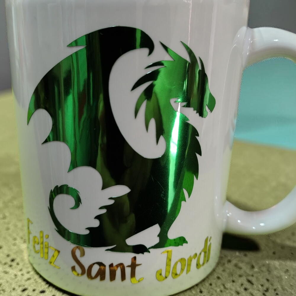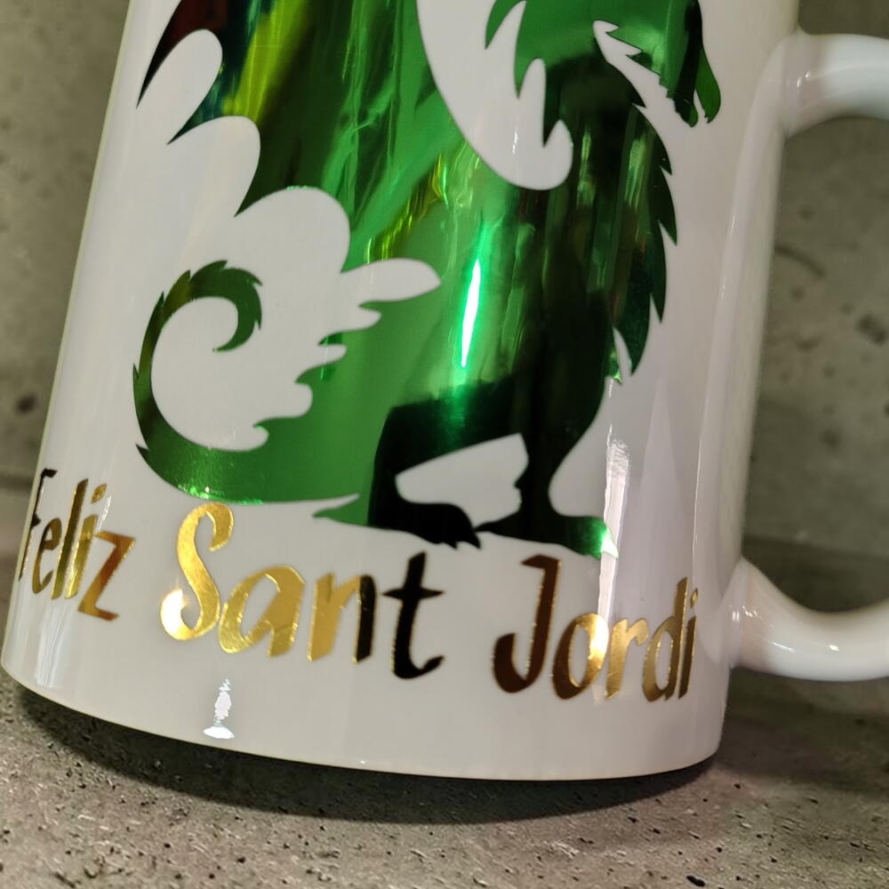 Offrez notre tasse personnalisée de 295 ml sur le thème de Sant Jordi, personnalisée en vinyle à effet miroir, avec une finition incroyable, offrez quelque chose de totalement différent en ce jour si spécial