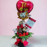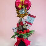 Ce splendide bouquet de fruits se compose de 300 gr de fraises fraîches, ainsi que de 10 délicieuses fraises recouvertes de chocolat. Pour en accentuer la beauté, il comporte 3 brochettes de guimauves en forme de cœurs ou de fleurs et un feuillage vert. Le tout est présenté sur une base en céramique, dont la couleur peut varier selon la disponibilité. De plus, le bouquet inclut un ballon de 10 et une carte de dédicace pour personnaliser ton message. Un détail à la fois sucré et sain pour célébrer n'importe quelle occasion.