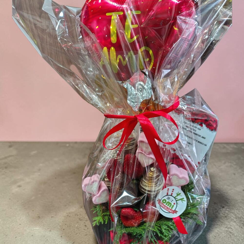 Ce splendide bouquet de fruits se compose de 300 gr de fraises fraîches, ainsi que de 10 délicieuses fraises recouvertes de chocolat. Pour en accentuer la beauté, il comporte 3 brochettes de guimauves en forme de cœurs ou de fleurs et un feuillage vert. Le tout est présenté sur une base en céramique, dont la couleur peut varier selon la disponibilité. De plus, le bouquet inclut un ballon de 10 et une carte de dédicace pour personnaliser ton message. Un détail à la fois sucré et sain pour célébrer n'importe quelle occasion.