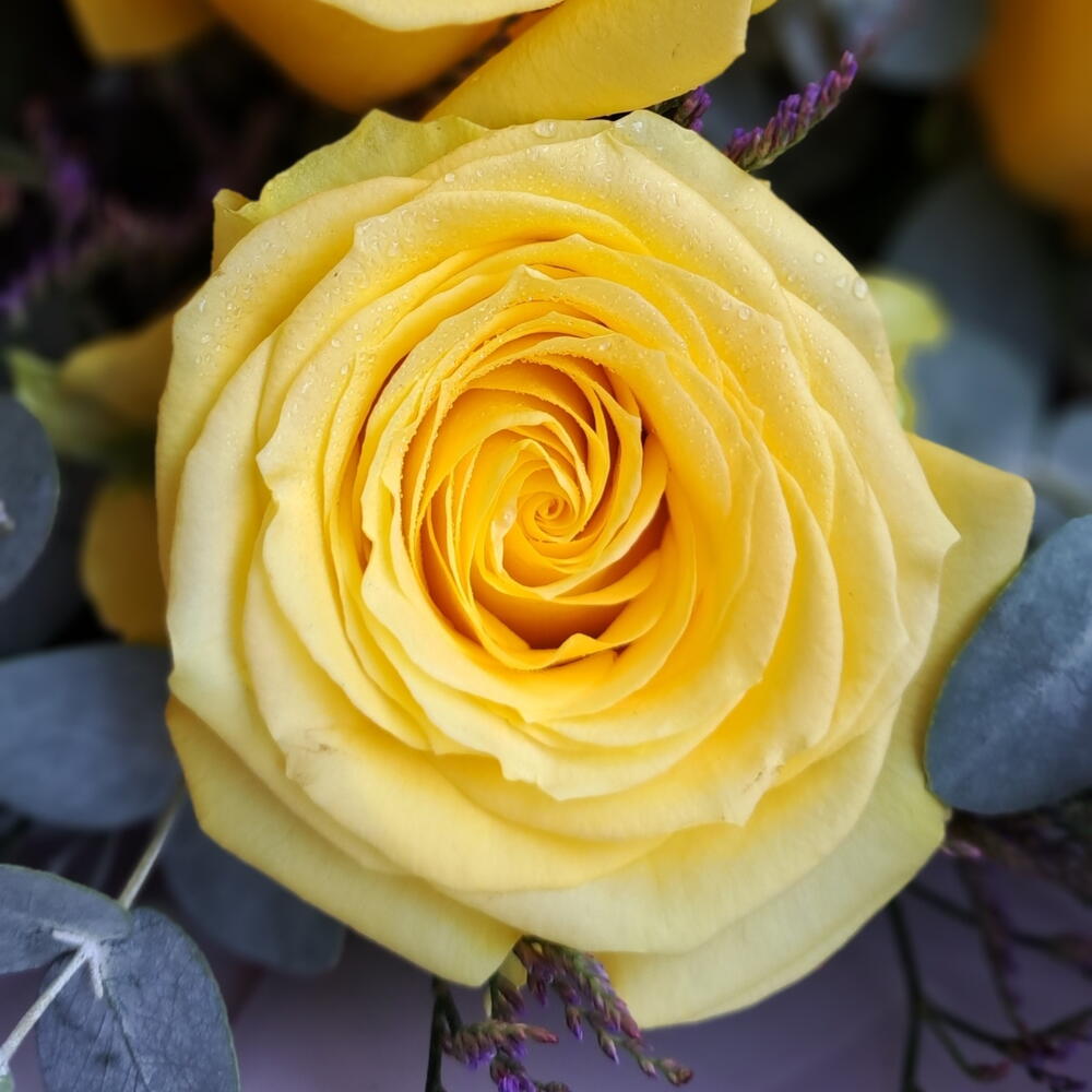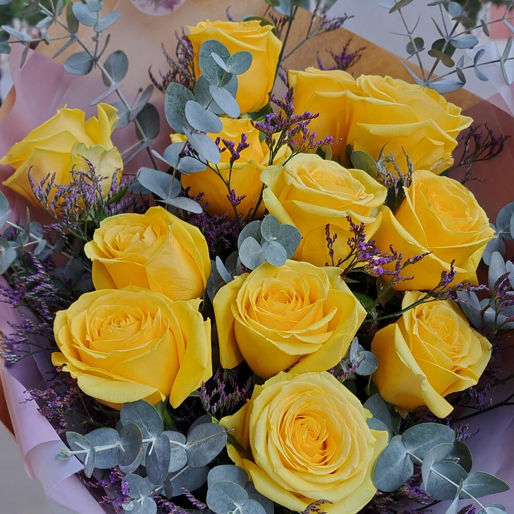 Limonium - 5 pce roses jaunes - 12 pce eucalyptus cinerea - 5 pce