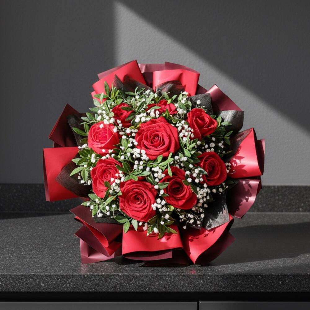 À mon amour – bouquet premium de 9 roses rouges avec gypsophile et pistacia