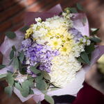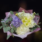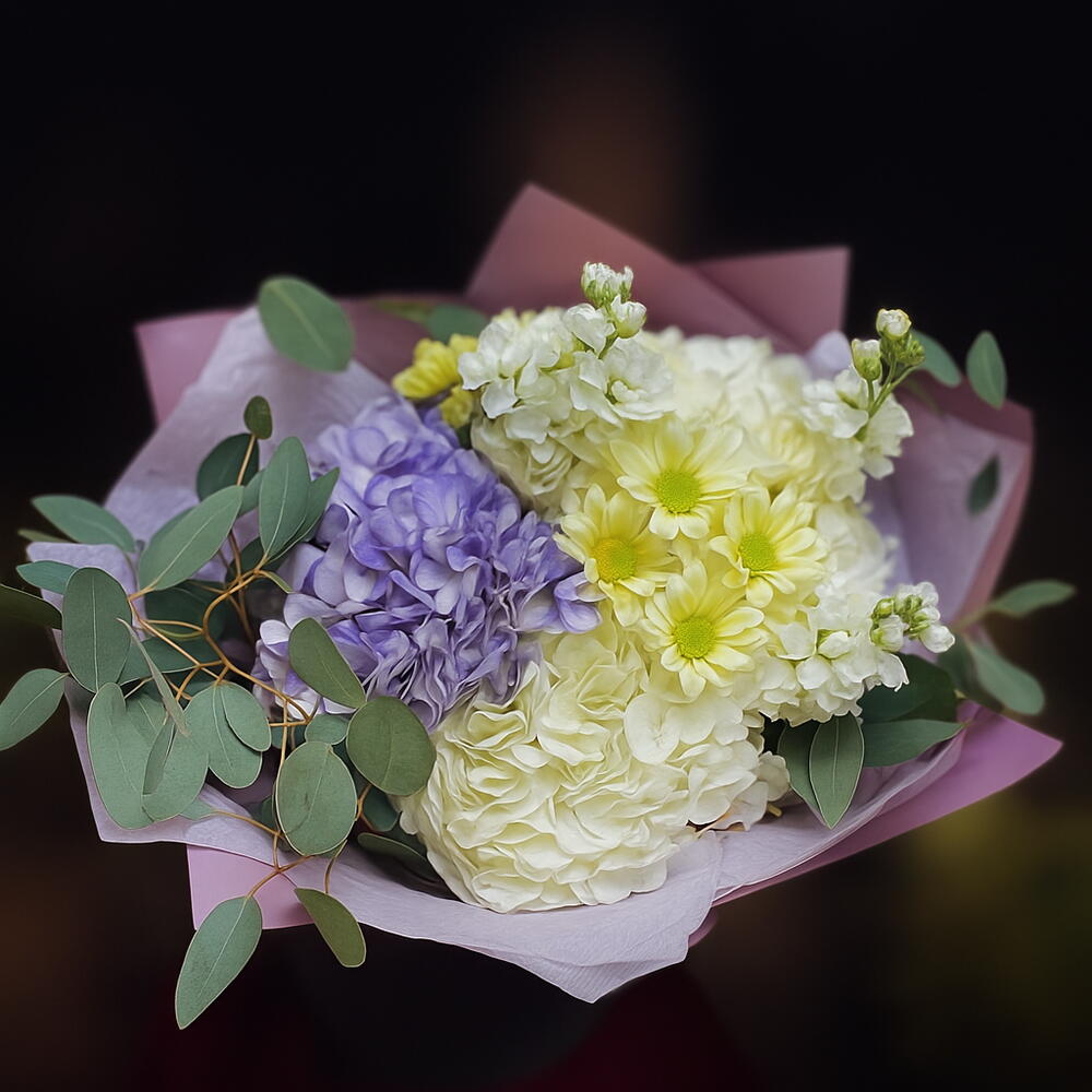 La combinaison d'hortensias blancs, de tons lavande et de chrysanthèmes jaune pâle crée dans ce bouquet une sensation de légèreté et de fraîcheur. C'est comme une brise douce par une journée ensoleillée : délicat, paisible et élégant. Ses tons doux, le vert naturel de l'eucalyptus et l'emballage en papier cadeau en font une composition universelle : idéale à offrir, pour décorer la maison ou le bureau. Bouquet légèrement plus grand que la taille moyenne, emballé dans un papier décoratif choisi selon les couleurs des fleurs.