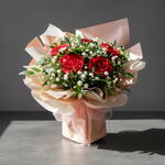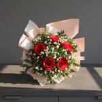 rosas rojas - 5 pce bouquet paticulata - 1 pce bouquet de pistacia - 1 pce éponge avec de l'eau - 1 pce papier lisse et blanc - 4 pce