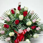 Cette composition florale respire l'élégance et le romantisme grâce à l'harmonieuse combinaison de roses rouges, blanches et roses. Chaque couleur porte une signification particulière : le rouge symbolise l'amour profond, le blanc la pureté et le rose la tendresse, créant ainsi un message visuel empreint d'émotions positives. La composition est sublimée par de délicates gypsophiles et un feuillage vert éclatant qui lui confère fraîcheur et volume. Sa forme généreuse et équilibrée en fait un choix idéal pour les célébrations, les anniversaires ou toute déclaration d'amour inoubliable. Pour la conserver plus longtemps, il est conseillé de la placer dans un endroit frais, à l'abri de la lumière directe du soleil, et de vaporiser légèrement les fleurs d'eau quotidiennement. Il est également recommandé de retirer les fleurs fanées au fil des jours afin de préserver sa beauté naturelle.