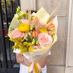 Ce charmant bouquet associe la chaleur de l'aube à la fraîcheur d'un champ en fleurs. Les douces roses pêche et les vibrantes renoncules jaunes se mêlent à de délicates tulipes orangées et à des accents de blé doré, créant un équilibre parfait entre élégance et naturel. La touche de solidago jaune ajoute luminosité et texture, évoquant le calme d'une matinée ensoleillée. Parfait pour surprendre lors d'un anniversaire, pour des remerciements ou simplement pour égayer la journée d'un être cher. Ce bouquet symbolise la joie, la fraîcheur et l'amour sincère.