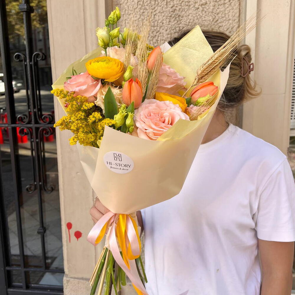 Ce charmant bouquet associe la chaleur de l'aube à la fraîcheur d'un champ en fleurs. Les douces roses pêche et les vibrantes renoncules jaunes se mêlent à de délicates tulipes orangées et à des accents de blé doré, créant un équilibre parfait entre élégance et naturel. La touche de solidago jaune ajoute luminosité et texture, évoquant le calme d'une matinée ensoleillée. Parfait pour surprendre lors d'un anniversaire, pour des remerciements ou simplement pour égayer la journée d'un être cher. Ce bouquet symbolise la joie, la fraîcheur et l'amour sincère.