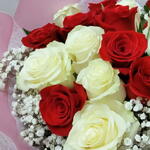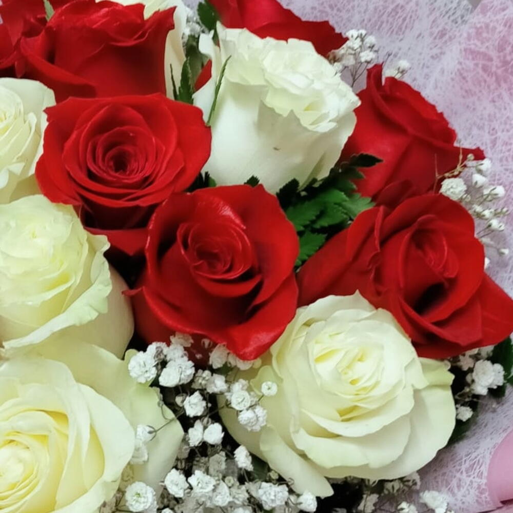 Ce bouquet classique est une fusion organique de beauté et d'élégance. Il se compose de 10 roses rouges, vibrantes et passionnées; 8 roses blanches, qui symbolisent la pureté et l'innocence; 3 tiges de paniculata blanches, ajoutant une touche subtile de délicatesse, et 5 unités de ruscus vert, offrant un soutien sophistiqué et frais. Ce bouquet est une célébration de la nature et de l'art floral dans leurs formes les plus authentiques et attrayantes.