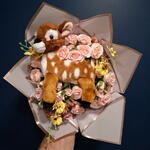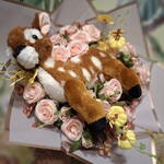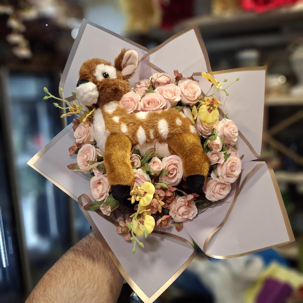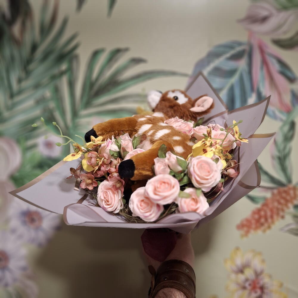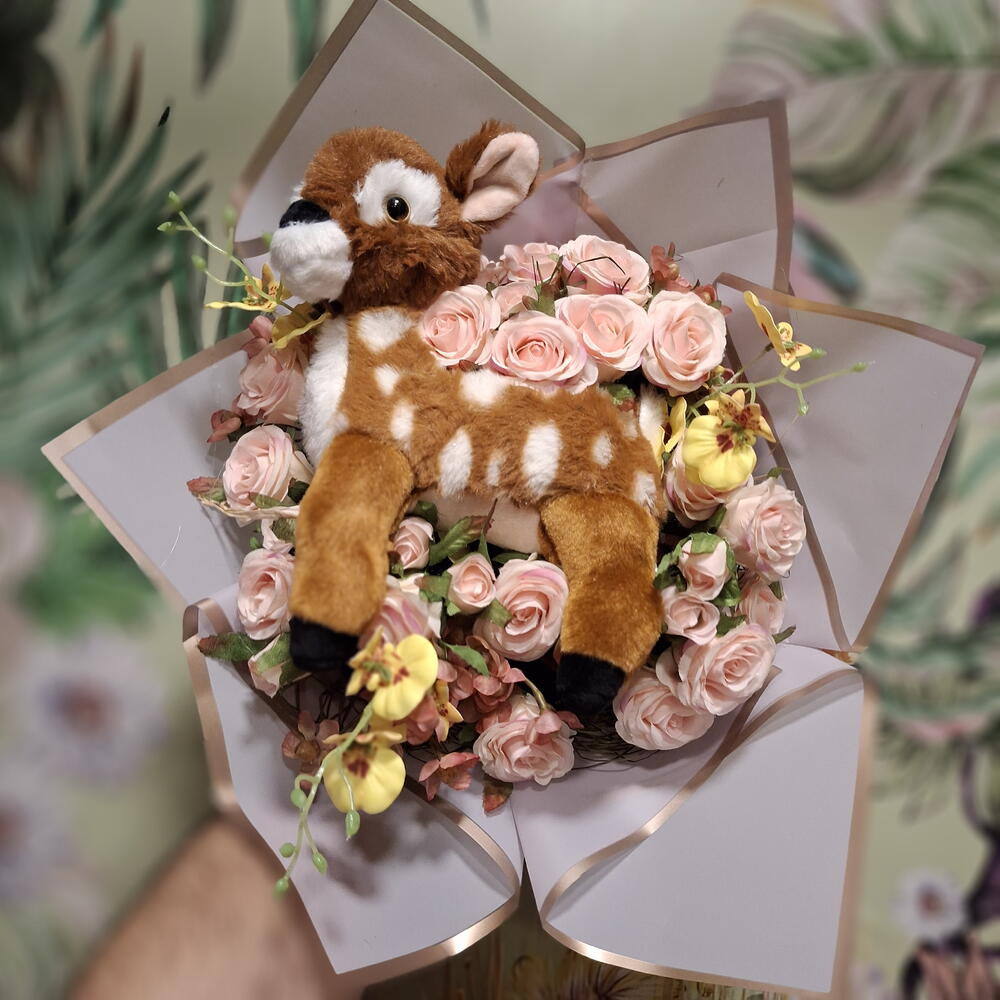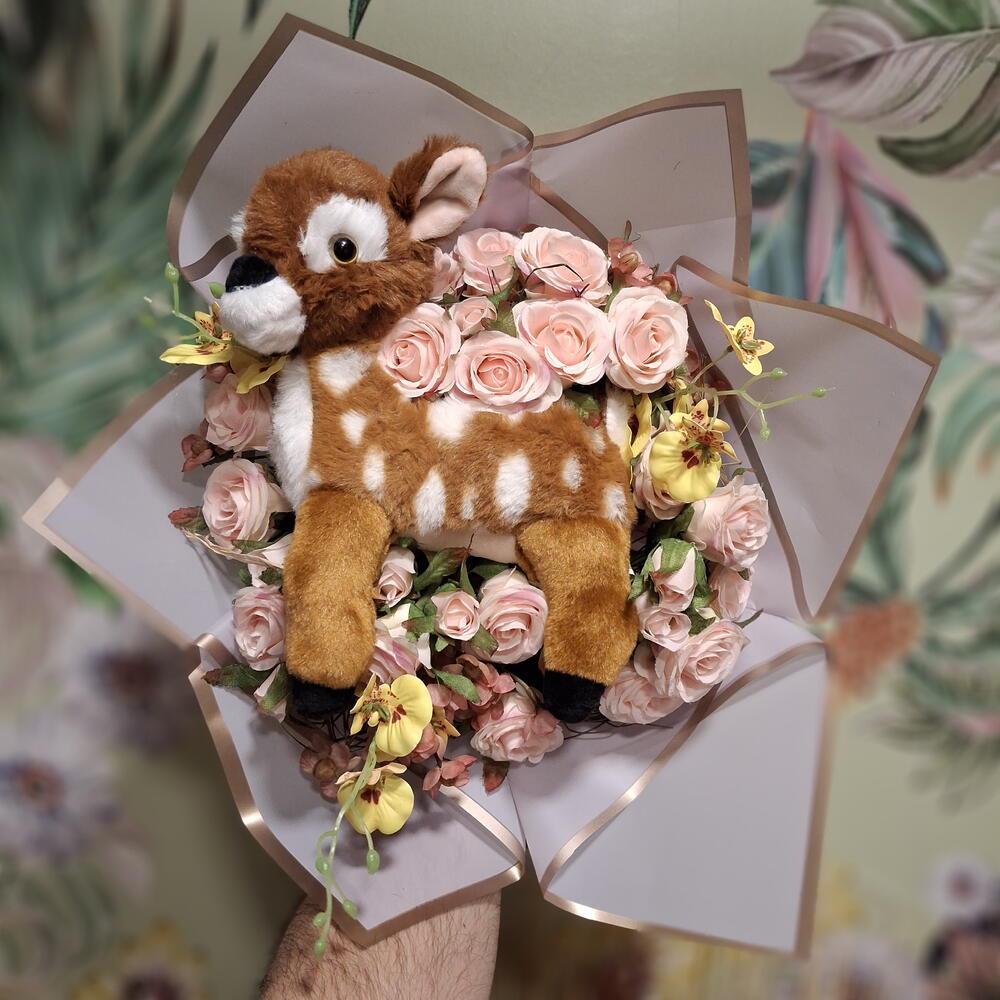 Bouquet de fleurs en tissu (27 roses, orchidées et gypsophile) avec une peluche de Bambi. Avec un ruban en tissu et du papier coréen. Carte de dédicace incluse