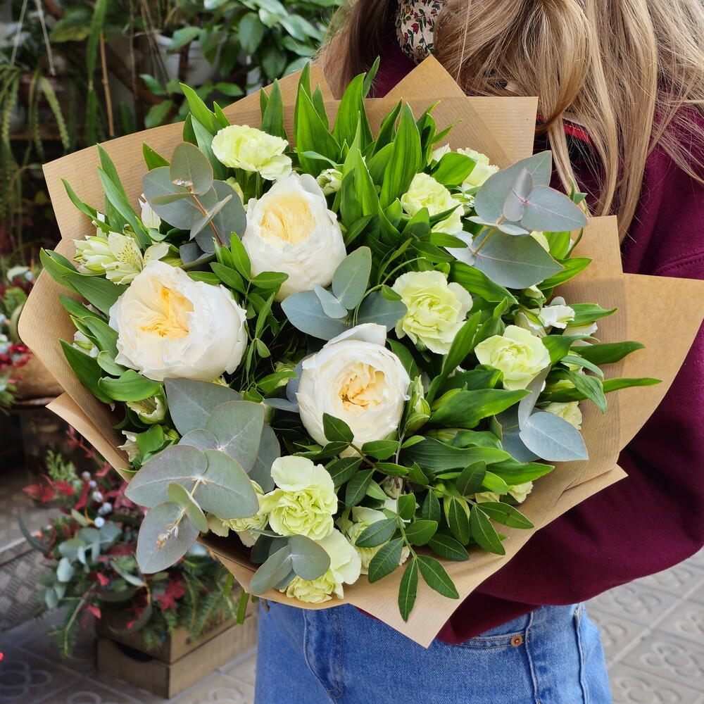 Un élégant bouquet aux tons verts et blancs qui évoque fraîcheur et sérénité. Avec de majestueuses roses blanches, de petits œillets crème et du feuillage d'eucalyptus, cet arrangement est une option sophistiquée pour toute occasion. Parfait pour les mariages, les anniversaires ou comme attention pour quelqu'un de spécial. Soins recommandés : coupez les tiges en biais avant de les placer dans un vase d'eau fraîche. Changez l'eau tous les deux jours et retirez les feuilles susceptibles d'être immergées. Conservez-le dans un endroit frais et à l'abri de la lumière directe du soleil pour prolonger sa fraîcheur et sa beauté.