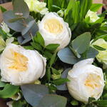 Eucalyptus - 1 pce papier kraft - 1 pce œillet vert - 10 pce lentisque - 1 pce alstroemères blanches - 10 pce rose jardin - 3 pce